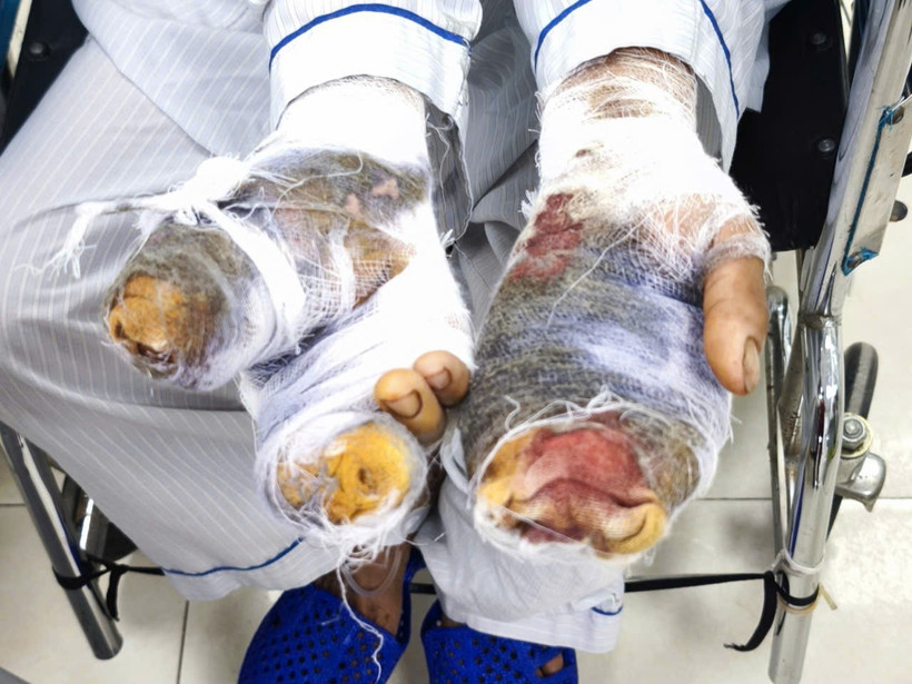 Bác sỹ Nguyễn Anh Tuấn - Khoa Ngoại chấn thương chỉnh hình và thần kinh cột sống cho biết bệnh nhân nhập viện với nhiều vết thương sâu ở cả hai bàn tay, trong đó bàn tay phải bị rách vùng gốc ngón cái, bàn tay trái có nhiều vết thương sâu, làm tổn thương gân và hạn chế vận động các ngón tay. Kết quả chụp X-quang cho thấy gãy đốt gần ngón thứ tư bàn tay trái.