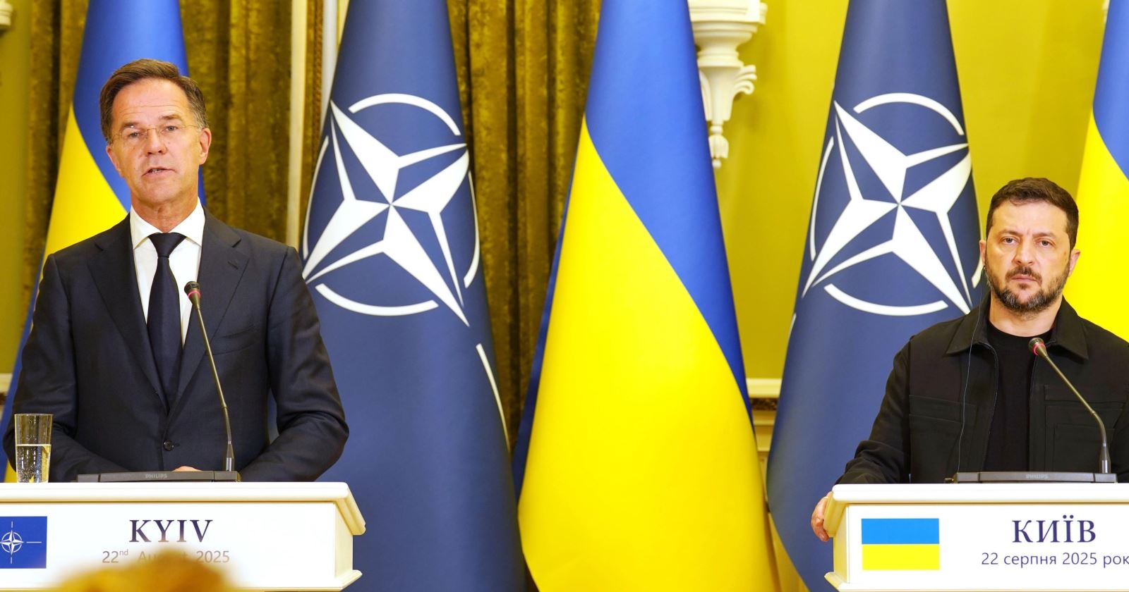 Tổng thống Ukraine Volodymyr Zelensky (phải) và Tổng Thư ký Tổ chức Hiệp ước Bắc Đại Tây Dương (NATO) Mark Rutte trong cuộc họp báo tại Kiev, ngày 22/8/2025. Ảnh: Kyodo/TTXVN