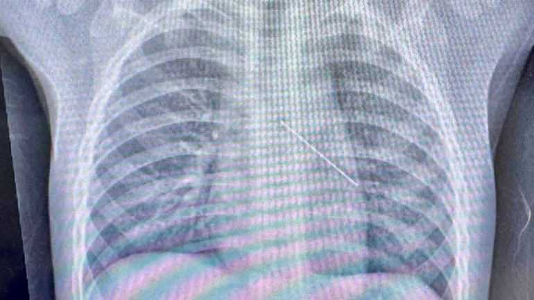 Hình ảnh chụp phim cho thấy rõ cây kim nằm trong phế quản bệnh nhi.