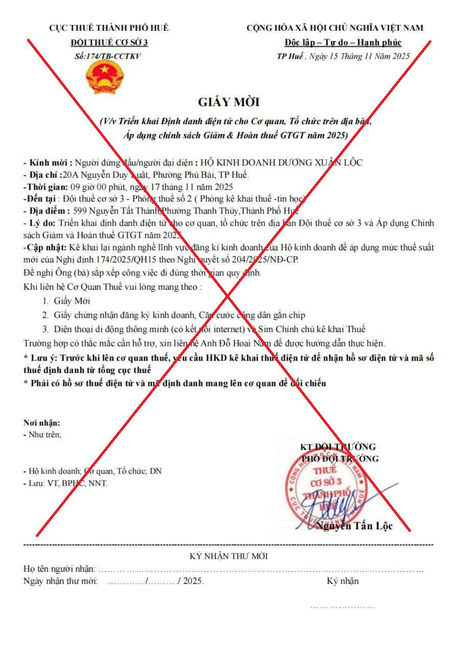 Theo đó, thời gian gần đây xuất hiện các cuộc gọi trực tiếp đến người nộp thuế, tự xưng là công chức Thuế TP Huế mời đến làm việc, hướng dẫn định danh điện tử cho cơ quan, tổ chức.