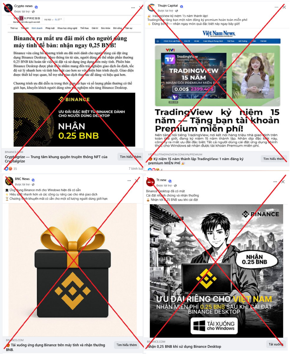 Sau đó, chúng chạy quảng cáo hoặc đăng tải các bài viết với nội dung hấp dẫn như “tặng tiền điện tử miễn phí”, “ưu đãi cho người dùng mới”, “hỗ trợ cài đặt phần mềm giao dịch trên máy tính” để thu hút người dùng truy cập.