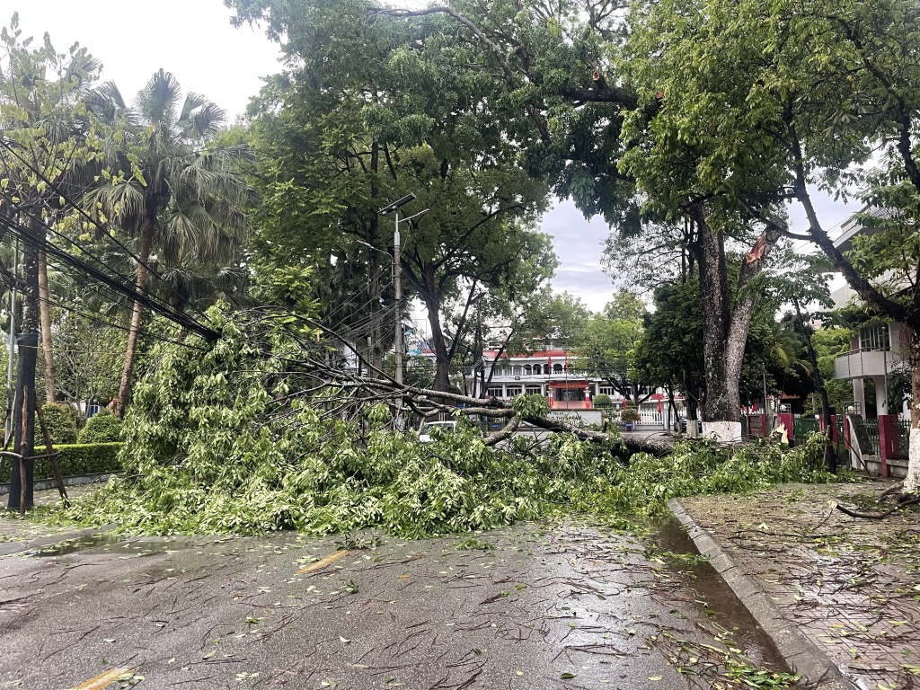 Cảnh cây lớn bị gãy cảnh đổ chắn gần hết lòng đường, gây khó khăn cho các phương tiện tham gia giao thông tại phường Thục Phán.