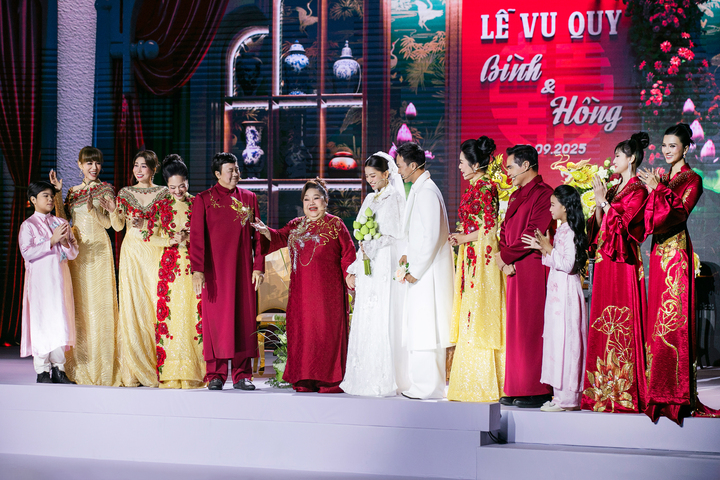 Đặc biệt, tiết mục còn có sự góp mặt của dàn nghệ sĩ gạo cội trong tiểu phẩm kịch ngắn: NSND Trịnh Kim Chi, NSND Ngọc Giàu, NSND Lê Khanh, NSƯT Bảo Quốc… tái hiện không khí một lễ cưới Việt Nam. Sân khấu ngập tràn sắc đỏ, điểm xuyết họa tiết rồng phượng, hoa sen, quạt giấy, dưới ánh sáng vàng son gợi ký ức đoàn viên. Các thiết kế áo dài trong màn này đậm tính nghi lễ: cổ áo cao truyền thống, tà áo dài phủ gấm thêu thủ công, đính kết tinh xảo.