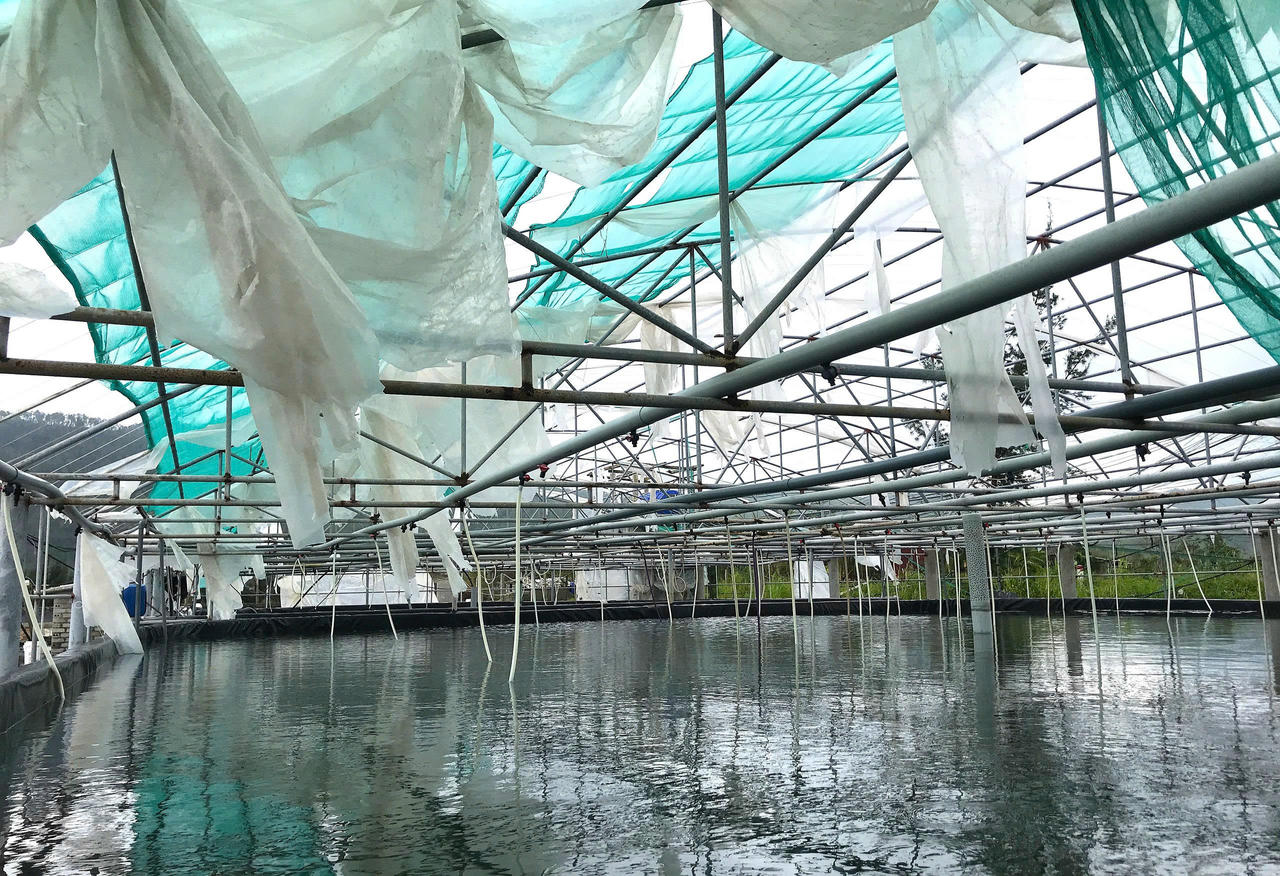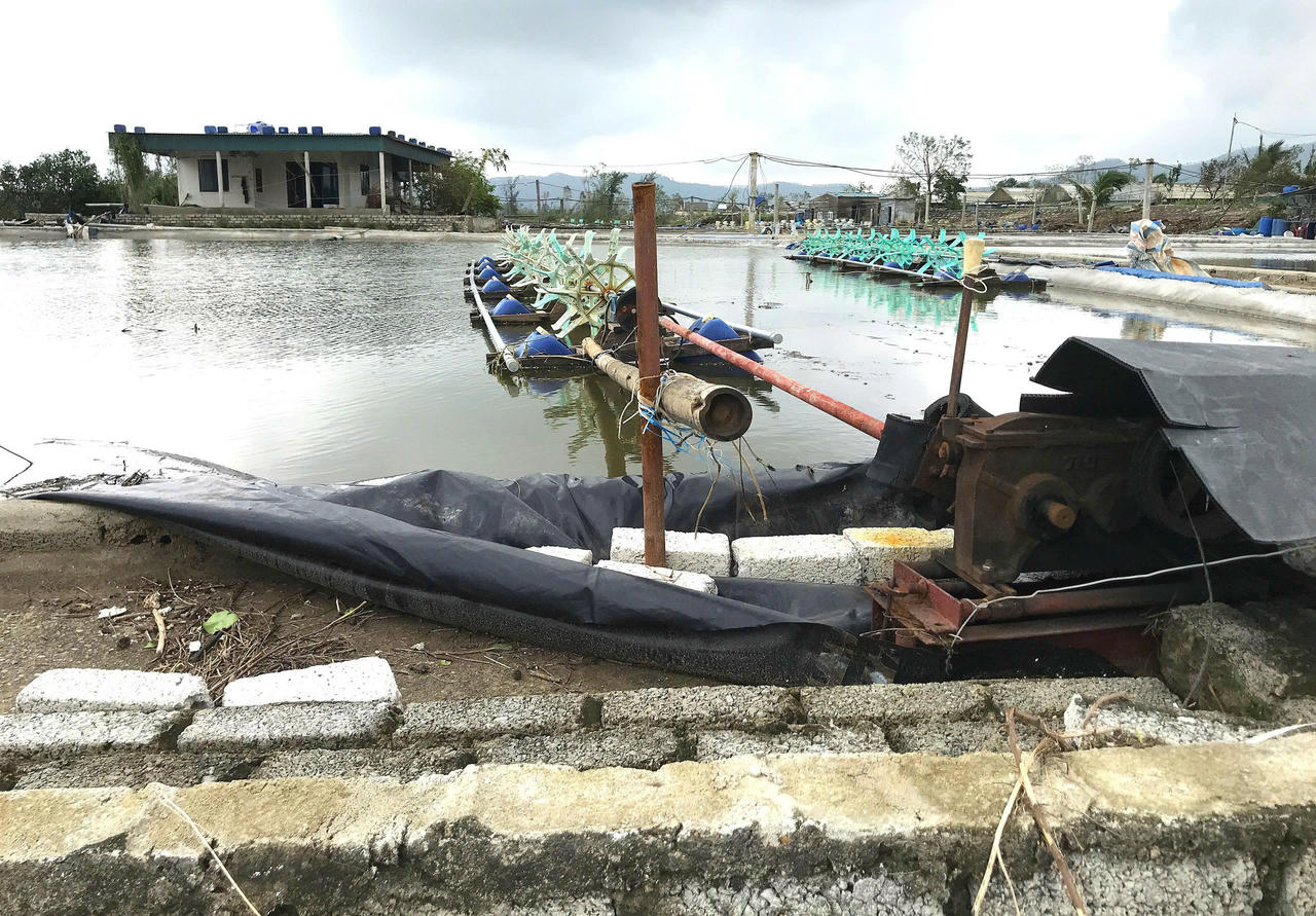 Hệ thống nhà ươm tôm giống, máy sục khí, mô tơ, bạt ao đều bị cuốn trôi hoặc biến dạng. Ảnh: ĐB.