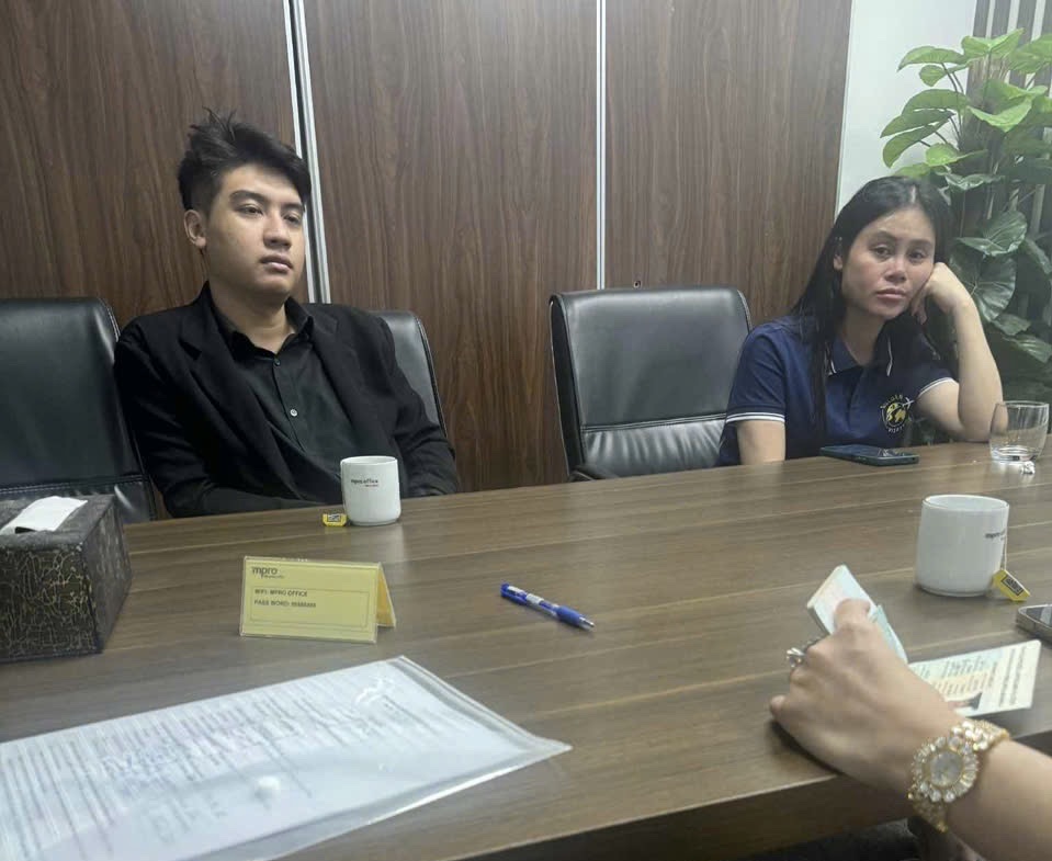 Bà Nguyễn Thị Loan, kế toán và ông Nguyễn Ngọc Anh, Trưởng phòng Công ty TNHH Du lịch Golden visa nhận tiền làm visa cho anh C.H và đến nay anh C.H không thể liên lạc với họ. Ảnh NVCC