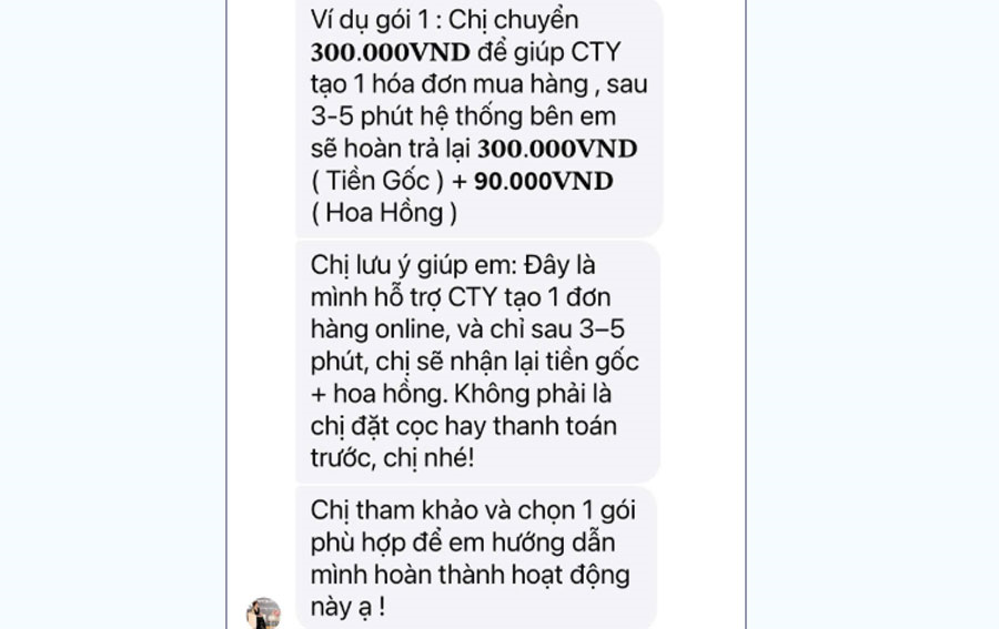 Những kẻ này đưa ra các những điều kiện hấp dẫn, như chuyển 300.000 đồng để tạo đơn hàng ảo và cam kết hoàn lại tiền gốc kèm 90.000 đồng hoa hồng chỉ sau vài phút. Để tạo niềm tin, chúng luôn khẳng định đây không phải hình thức đặt cọc hay thanh toán trước mà chỉ là “hỗ trợ doanh số”.