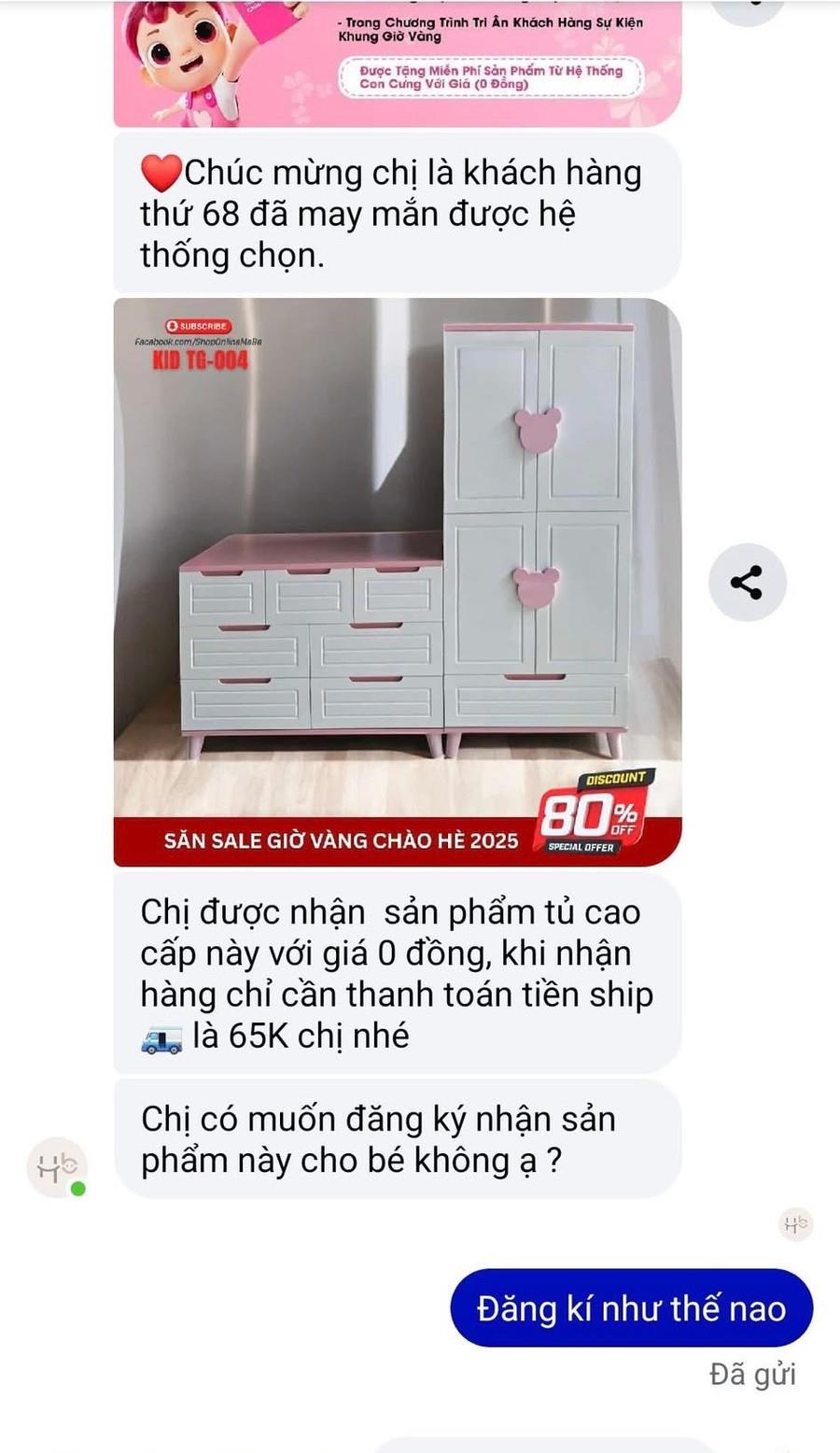 Theo đó, cuối tháng 8-2025, chị T. lên trang Facebook có tên: “Mẹ & Bé Đồ Trẻ Em-Chính hãng” để xem và đặt mua tủ đựng đồ cho em bé. Sau đó, trang này giới thiệu cho chị T. tủ đựng đồ em bé với giá 1.690.000 đồng. Bên cạnh đó, tài khoản Facebook “Mẹ & Bé Đồ Trẻ Em-Chính hãng” cho biết, do đang trong tháng sinh nhật của cửa hàng nên sản phẩm này được khuyến mãi chỉ còn 65.000 đồng.