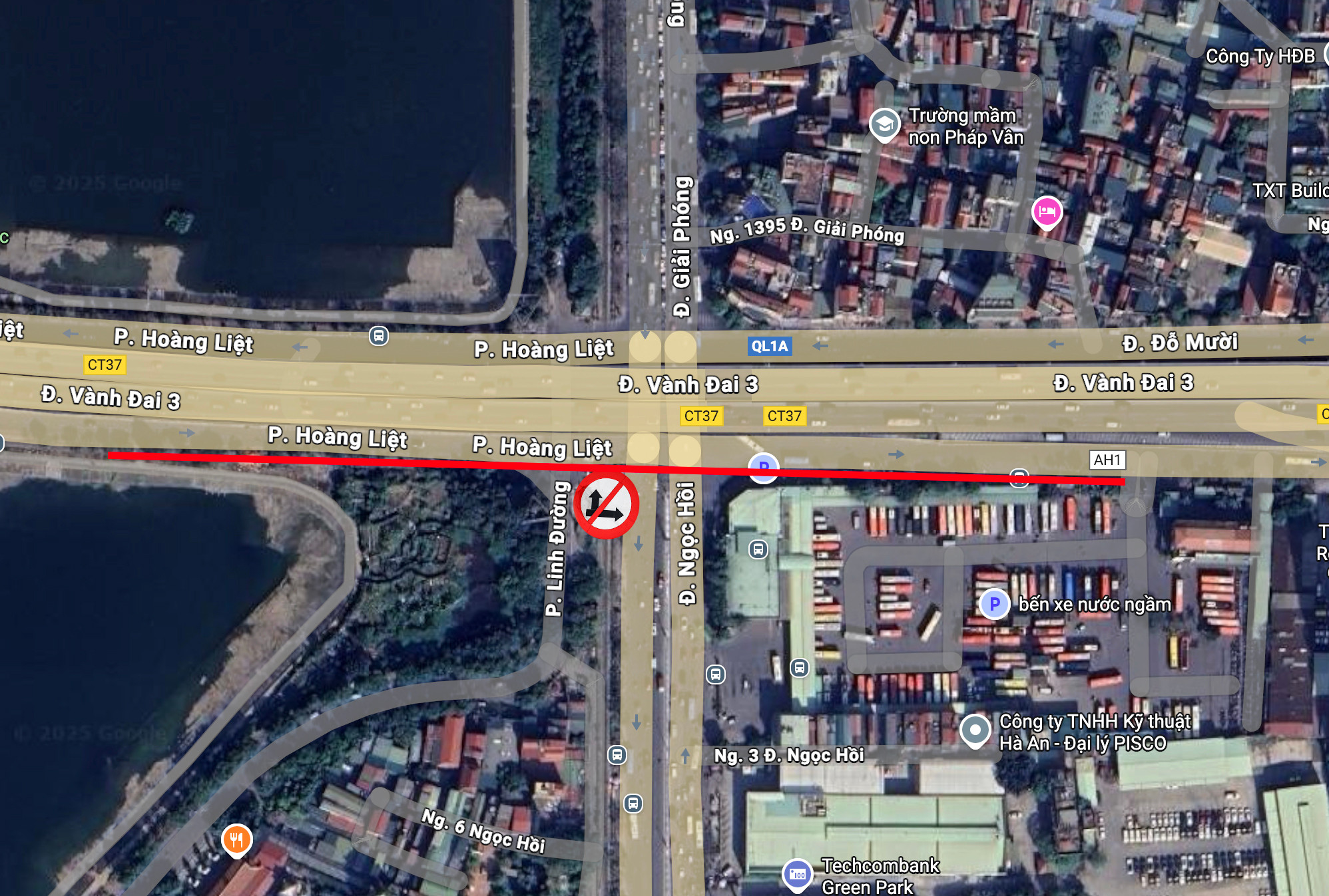 Đường Hoàng Liệt kết nối với nút giao này được lắp đặt biển cấm rẽ trái sang hướng Giải Phóng và cấm đi thẳng, các phương tiện buộc phải rẽ phải theo hướng Ngọc Hồi để di chuyển đến các tuyến đường khác.