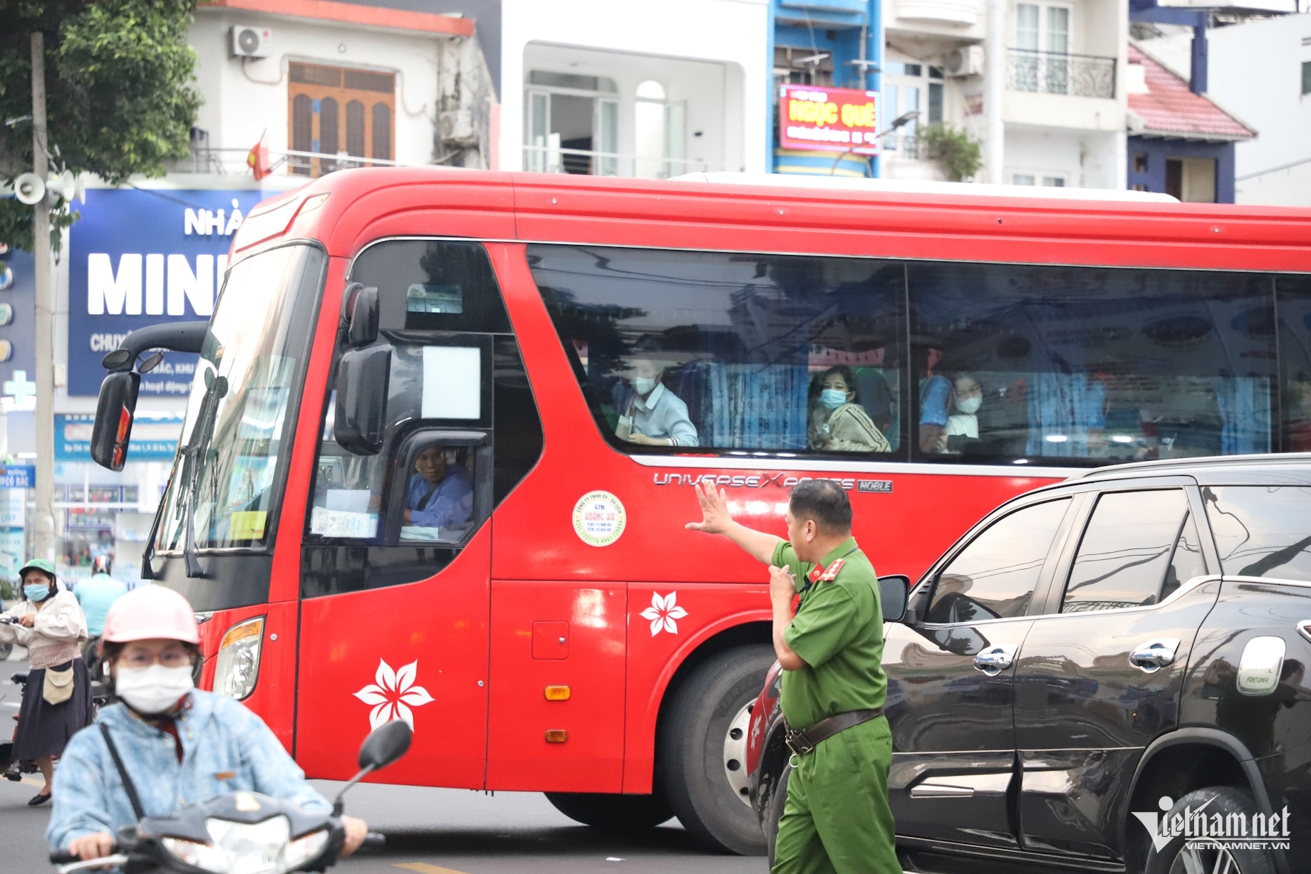 Lực lượng công an, CSGT và nhân viên đường sắt túc trực trước cổng vào ga Dĩ An để điều tiết giao thông, đảm bảo luồng xe trung chuyển không gây ùn tắc.