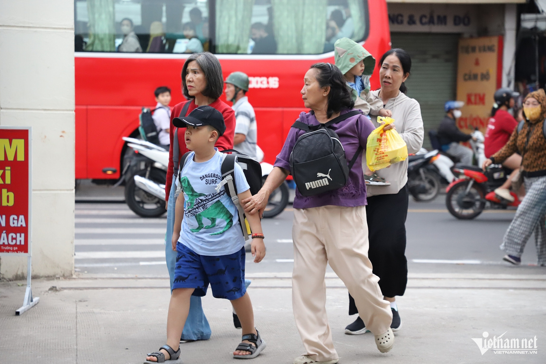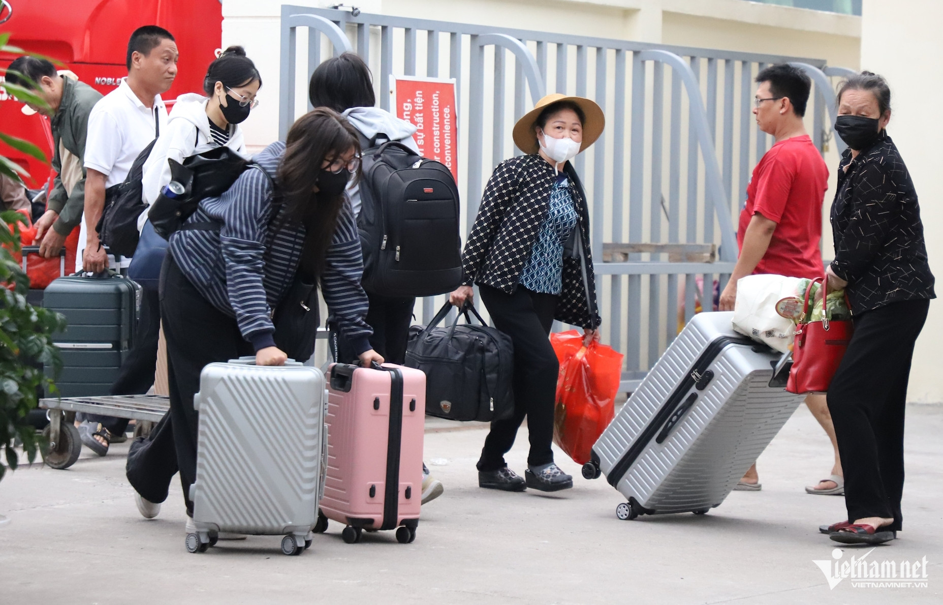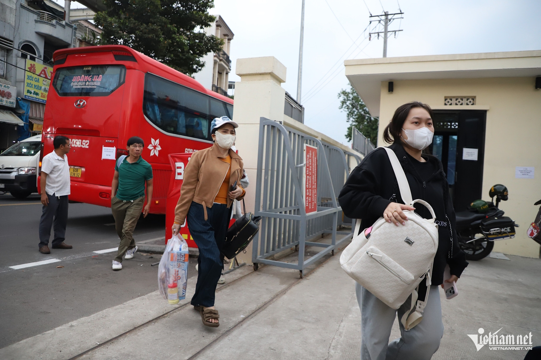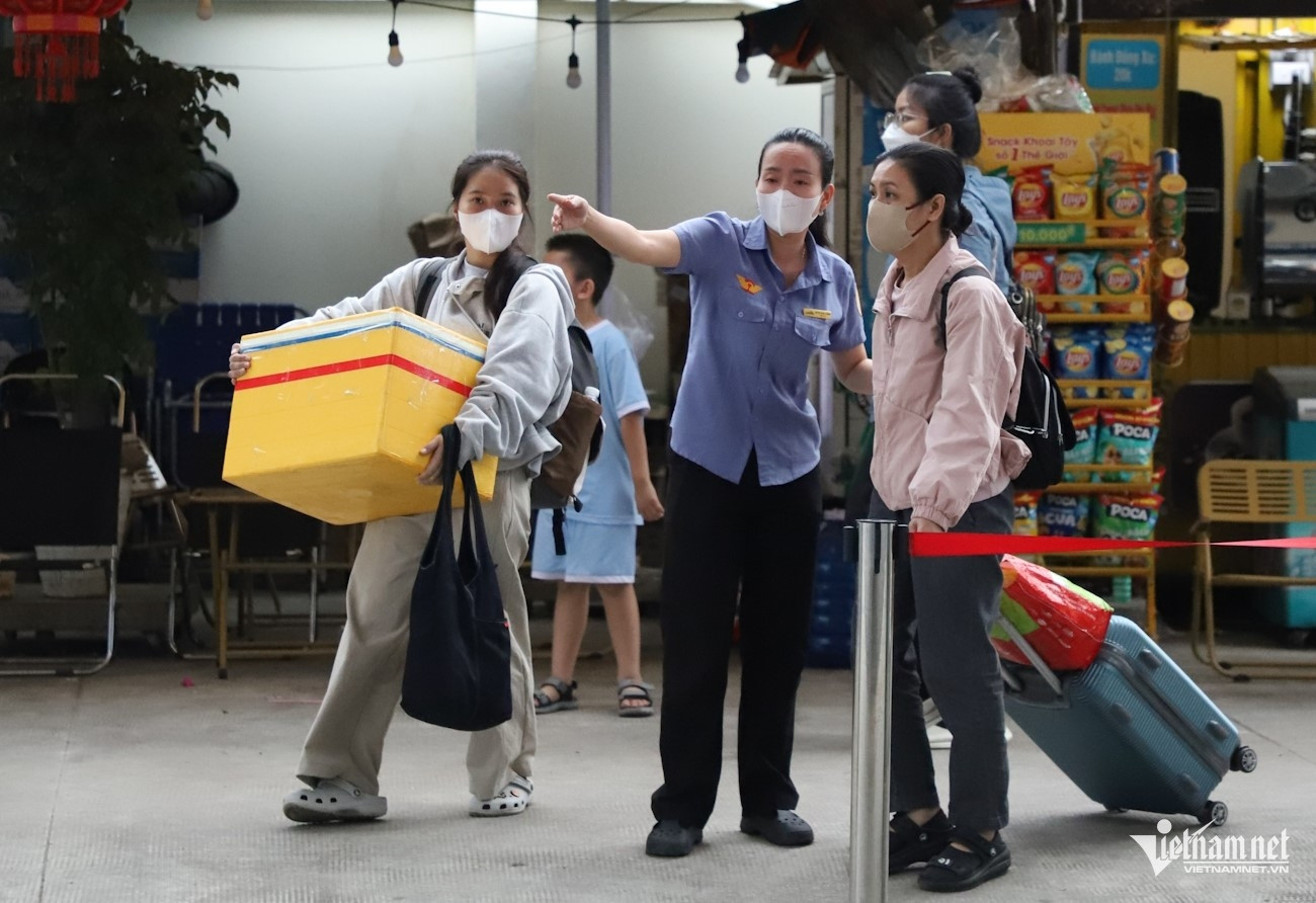 Tại cổng ga, dòng người nối đuôi nhau xuống xe khách, mang theo vali, túi xách, tiếp tục hành trình trên đường sắt.