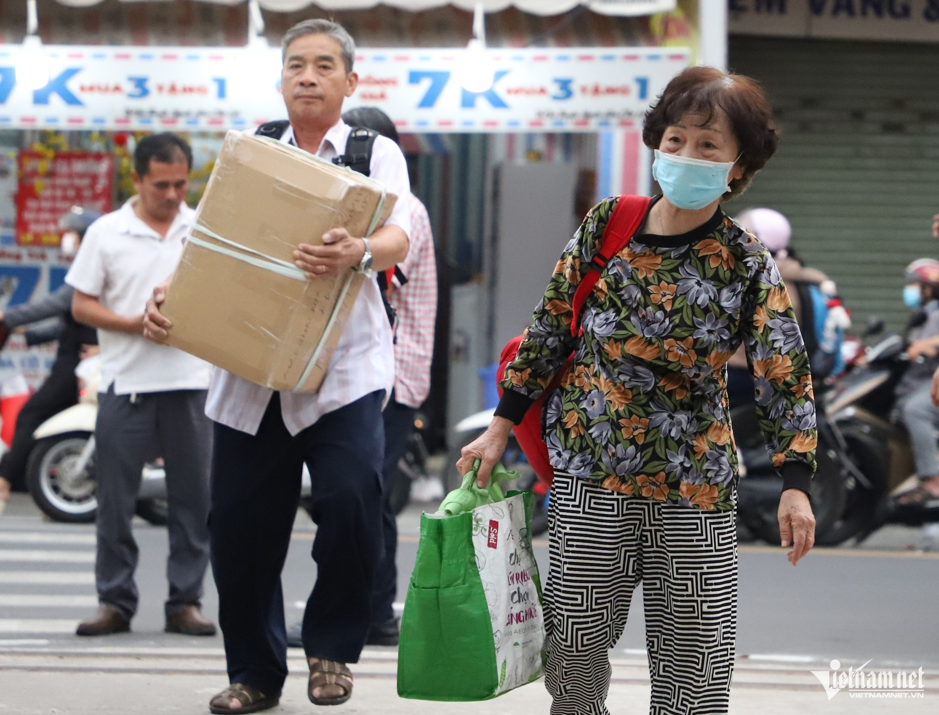 Ông Trần Văn Bảy (72 tuổi, quê Quảng Ngãi) lộ rõ vẻ mệt mỏi khi khệ nệ bê thùng hàng đựng đặc sản quê nhà.