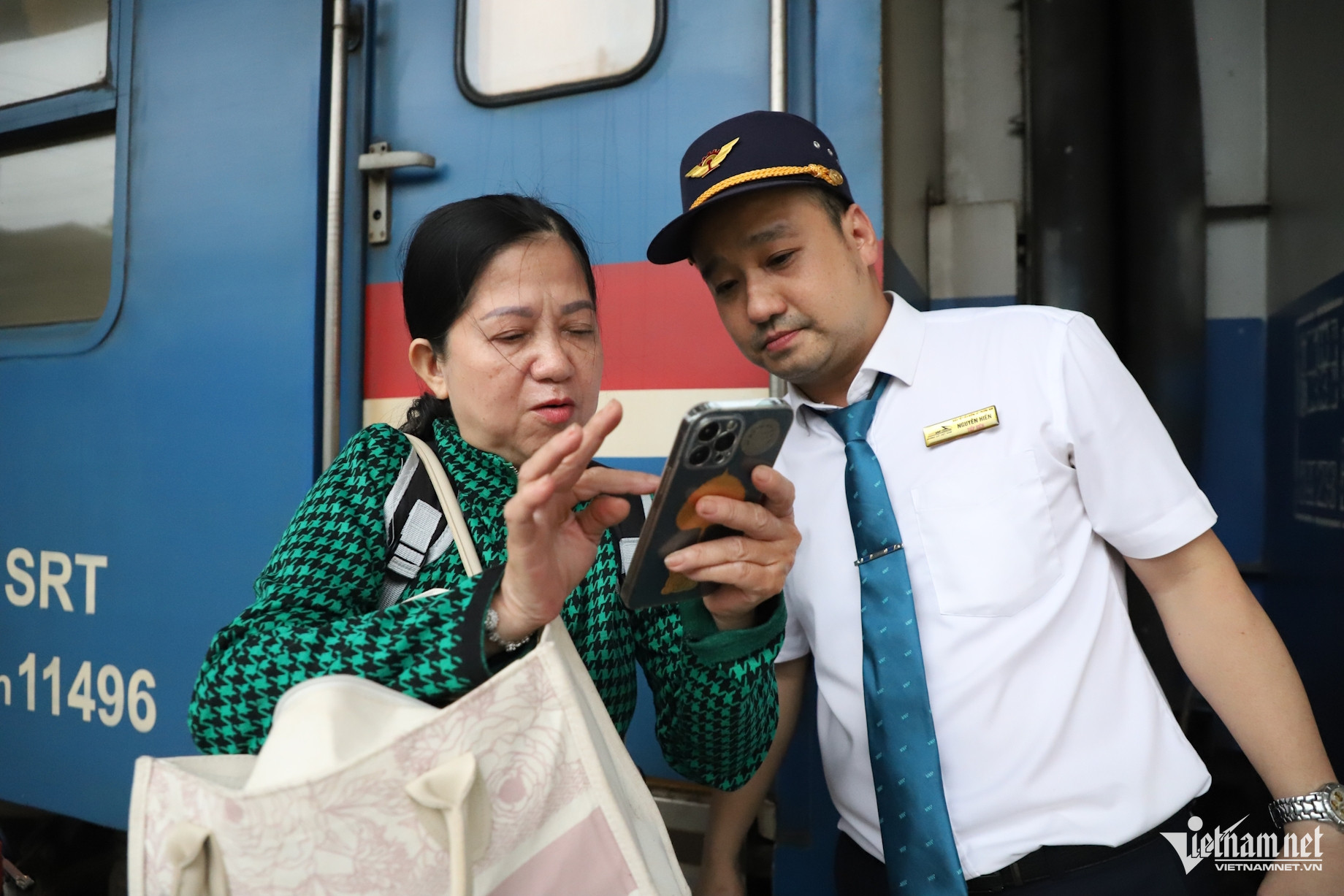 Một hành khách trung niên vội vã đưa điện thoại nhờ nhân viên đường sắt kiểm tra lại thông tin chuyến tàu kết nối. Trong hoàn cảnh này, thông tin về vé điện tử và giờ tàu chạy trở thành điều hành khách quan tâm nhất.