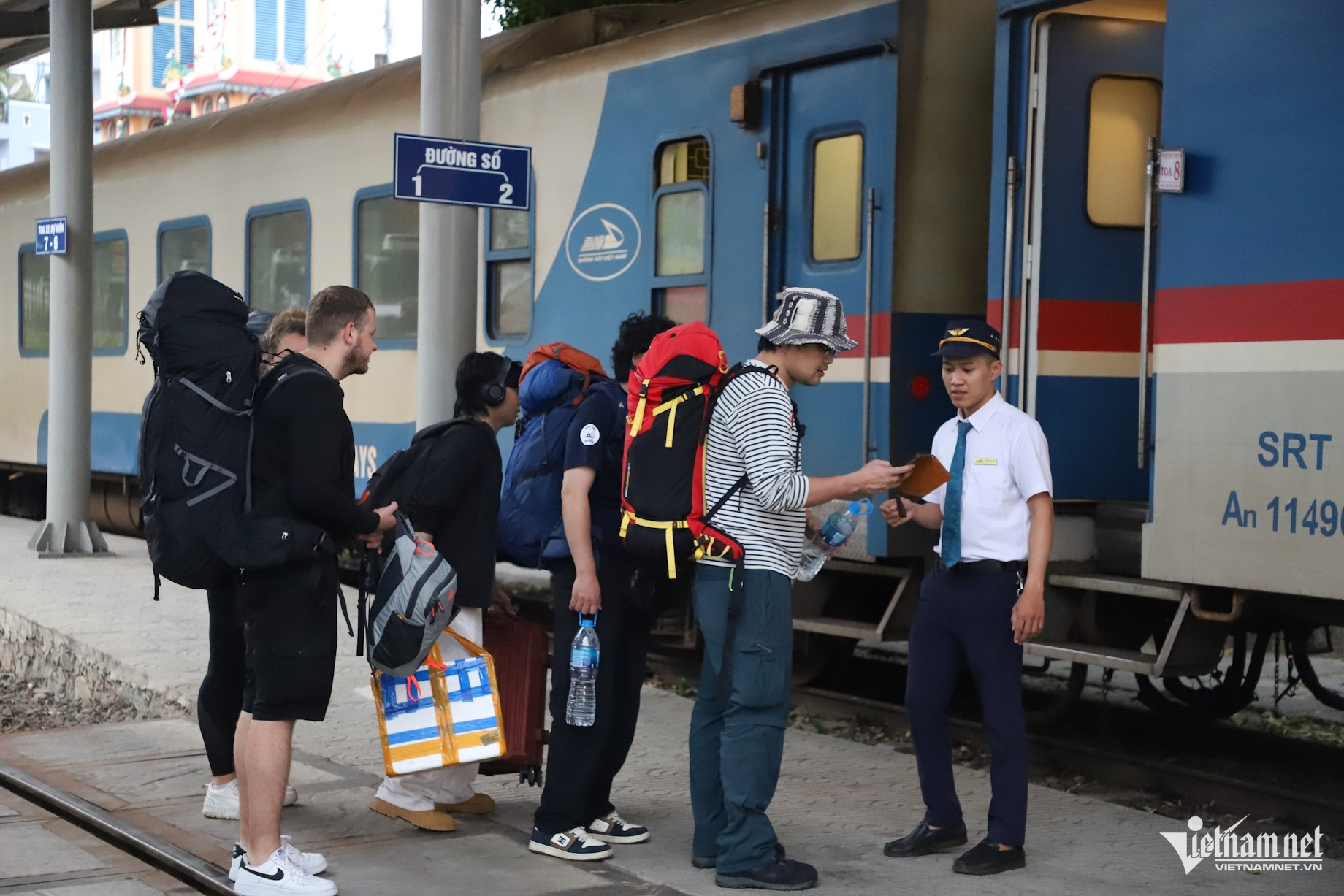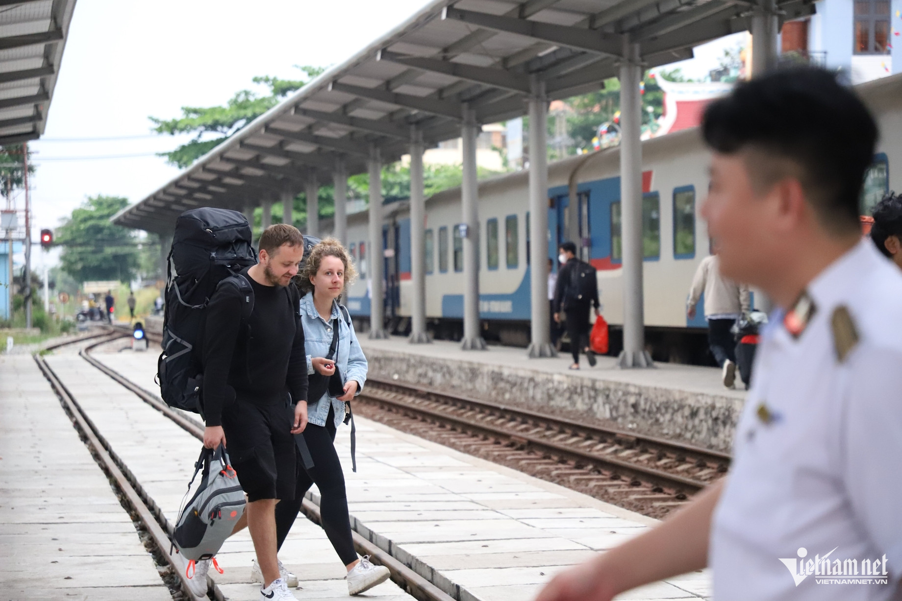 Nhiều khách nước ngoài với những chiếc ba lô trekking "khổng lồ" cũng ngơ ngác băng qua đường ray tại ga Dĩ An để tìm toa tàu tiếp tục hành trình.