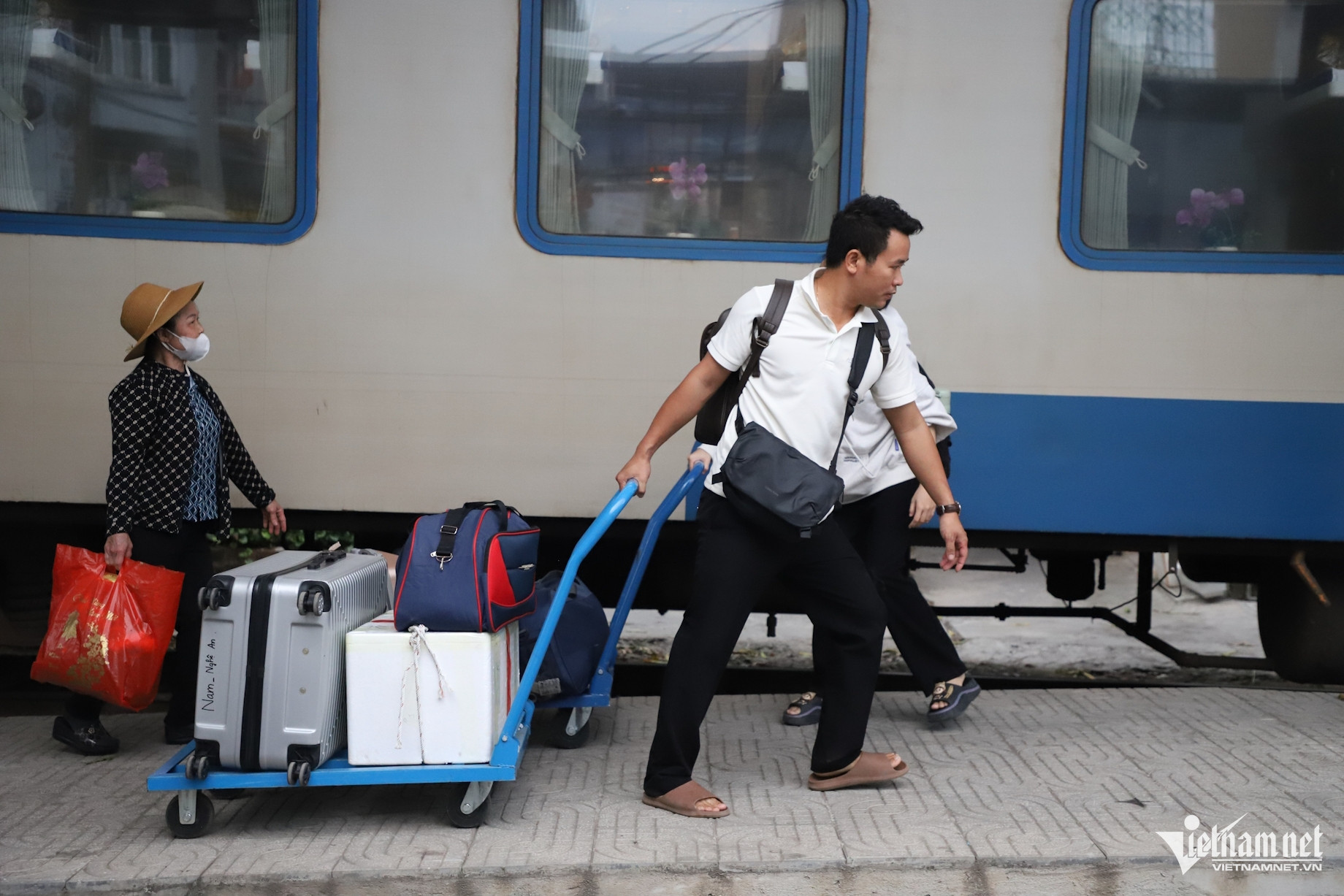 Vừa bước xuống xe, hàng trăm con người với lỉnh kỉnh hành lý vội vã di chuyển về phía đoàn tàu SE7 đang đợi sẵn.