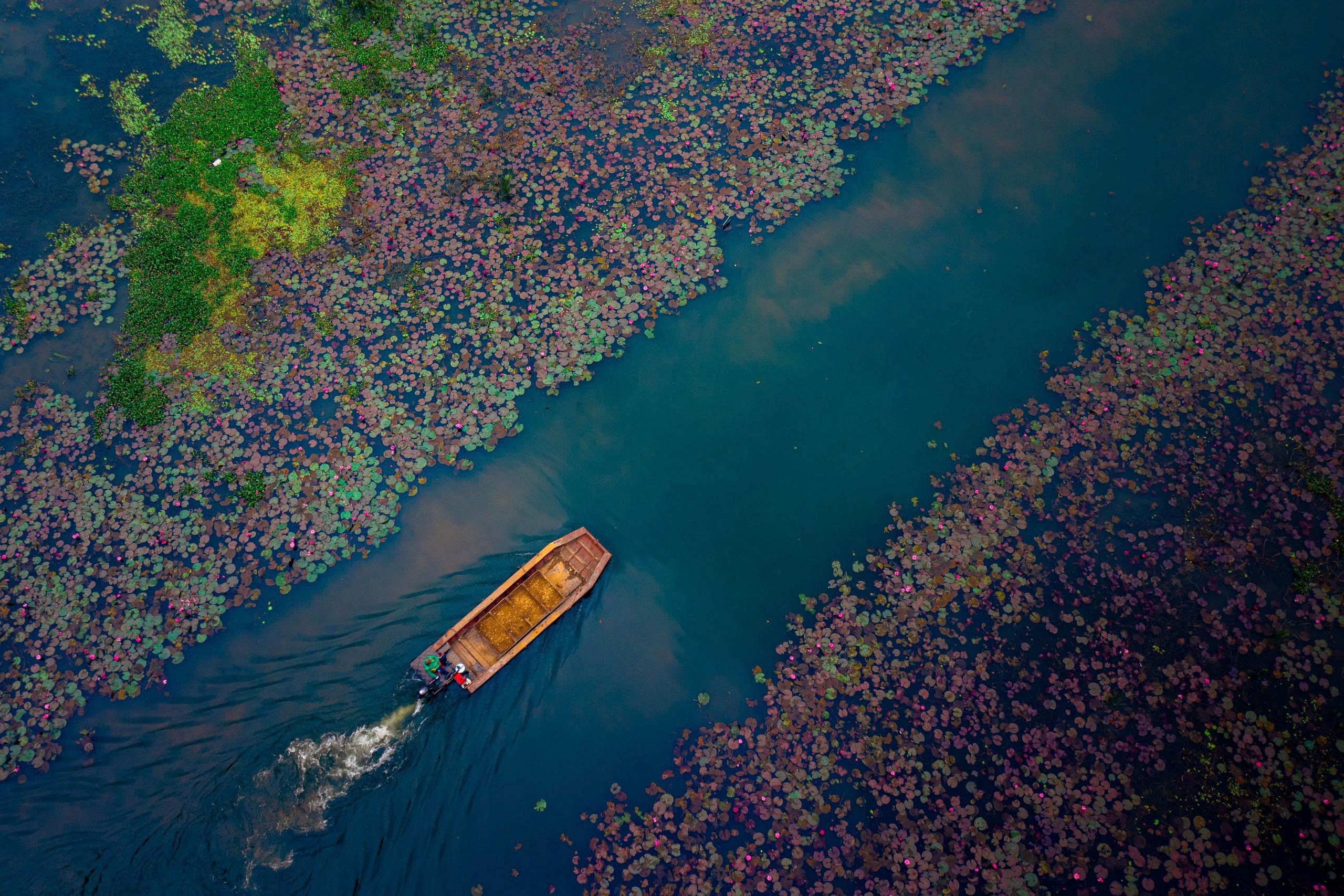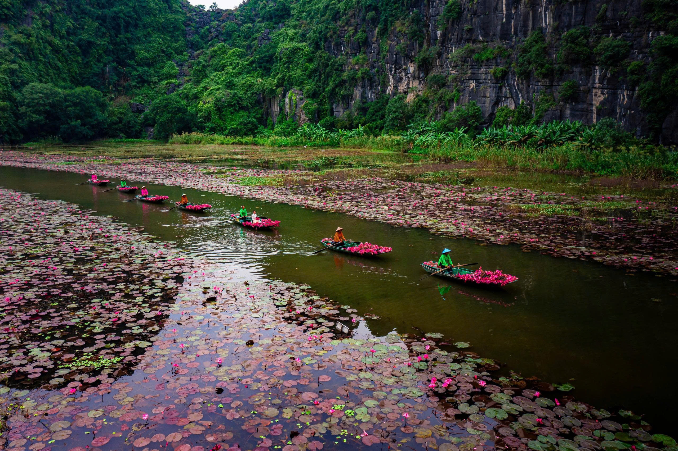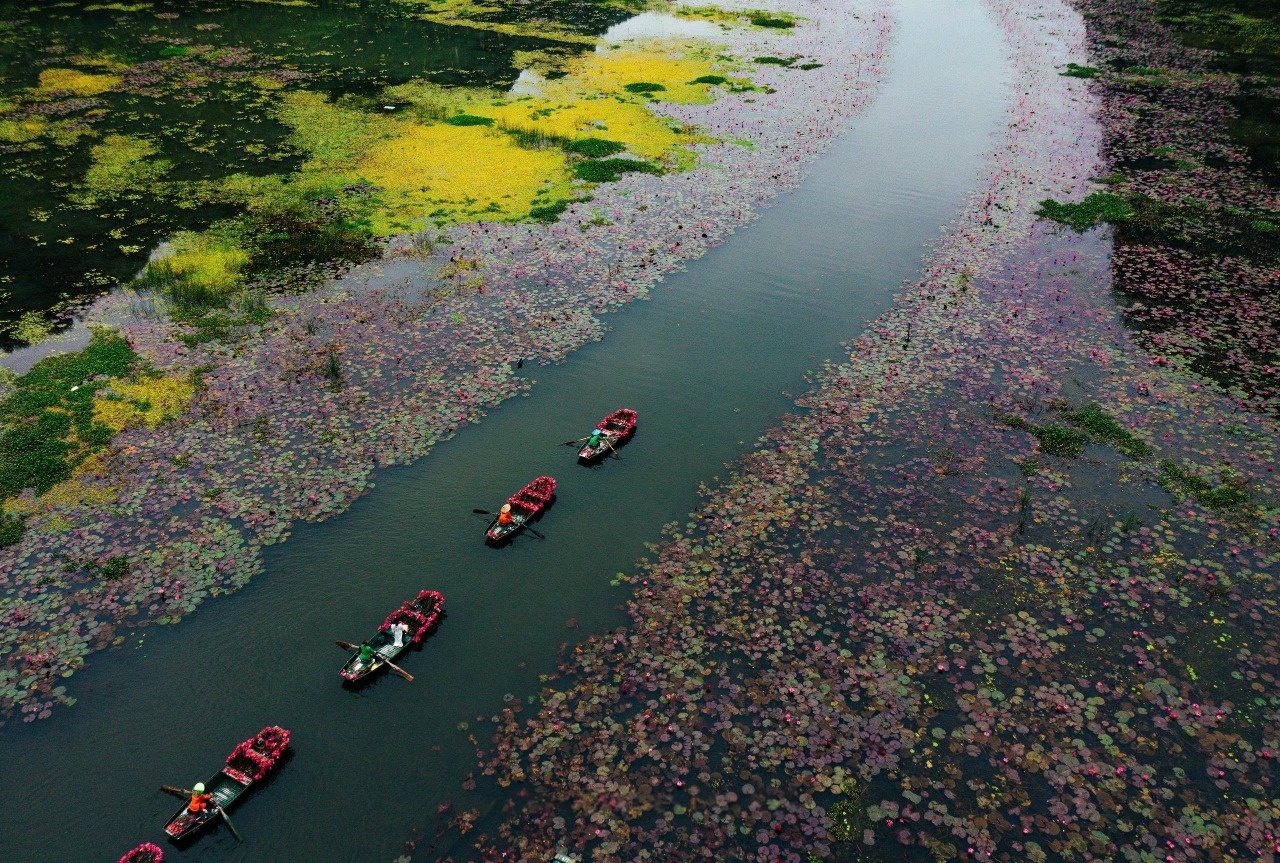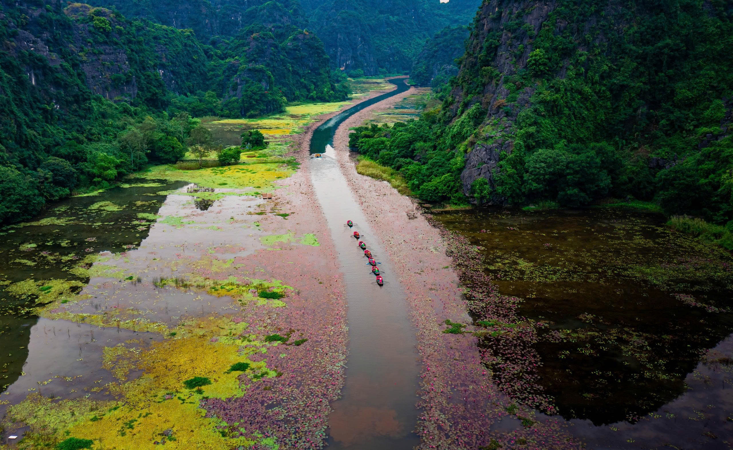 Sáng 25/10, nhiếp ảnh gia Nguyễn Trọng Cung (33 tuổi) khởi hành từ 2h để kịp tới Tam Cốc, đón bình minh trên dòng Ngô Đồng. Lần đầu trải nghiệm mùa hoa súng, anh ấn tượng với khung cảnh sông núi hữu tình, không khí trong lành của Ninh Bình. Những ngày cuối tháng 10, hoa súng bắt đầu nở rộ hai bên sông Ngô Đồng, nhuộm sắc hồng tím giữa làn nước xanh trong. Hoa nở đẹp nhất vào buổi sáng, lúc 7-11h, khi sương còn đọng trên cánh và nắng sớm phản chiếu qua mặt nước. Từ các điểm cao như đỉnh Mây, khe Giời, du khách có thể ngắm trọn bức tranh thiên nhiên thanh bình, điểm xuyết bởi những con thuyền nhỏ len giữa đồng hoa. "Khi vừa cho flycam bay lên, cảnh hiện ra thật sự ấn tượng. Tam Cốc có núi, có sông, cảnh quan vừa hùng vĩ vừa nên thơ", anh Cung nói với Tri Thức - Znews, ví cảm giác ấy "tự do, phiêu diêu như ở Lương Sơn Bạc".