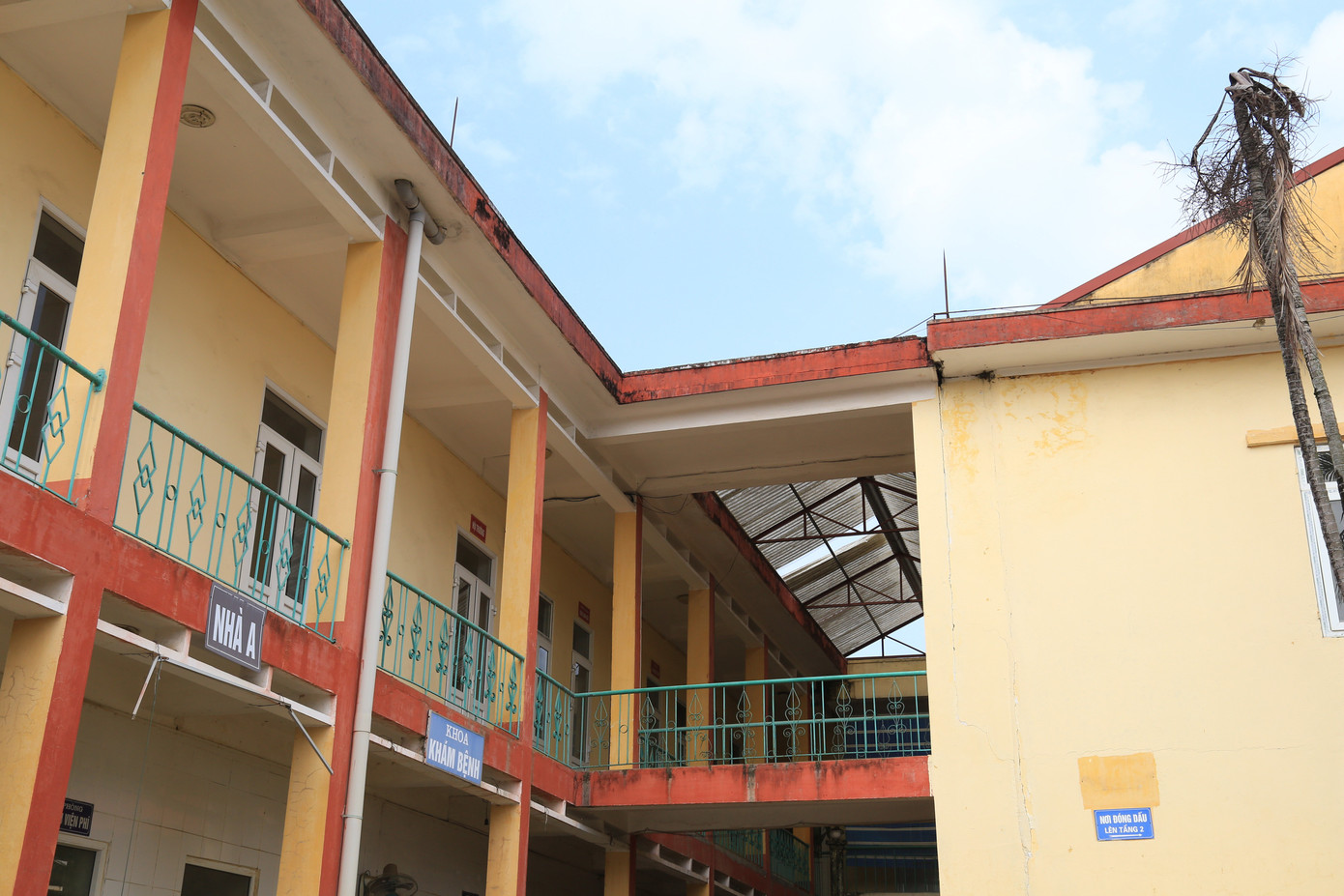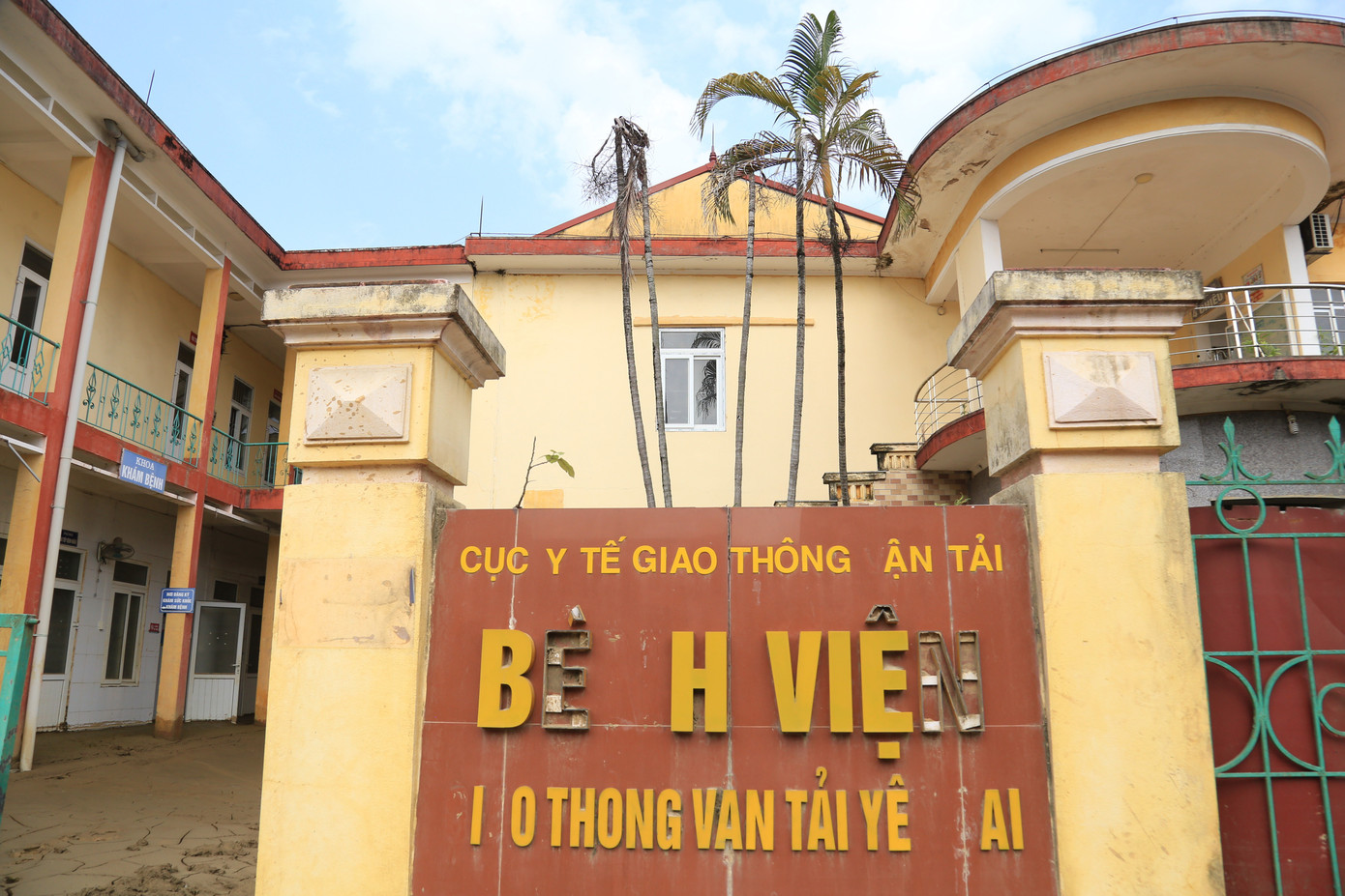 Những tấm bảng cũ kỹ trước cổng bệnh viện nay đã hư hỏng nặng. Nơi đây từng là cơ sở khám chữa bệnh cho cán bộ và người dân, được trang bị nhiều thiết bị hiện đại như máy siêu âm màu 5D, nội soi dạ dày, chụp X-quang kỹ thuật số, điều trị Đông y, Răng - Hàm - Mặt ...