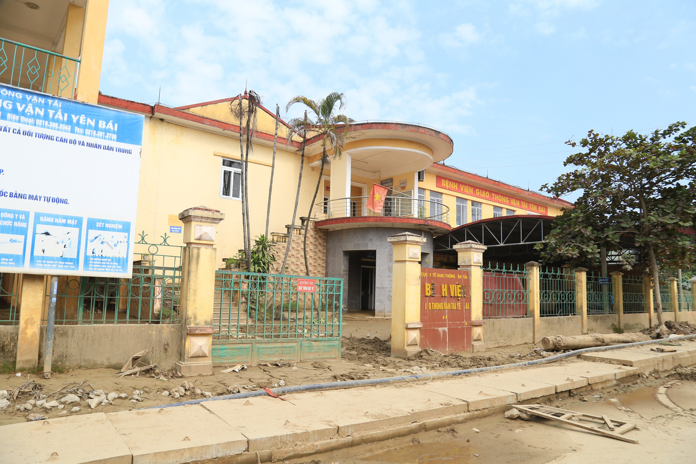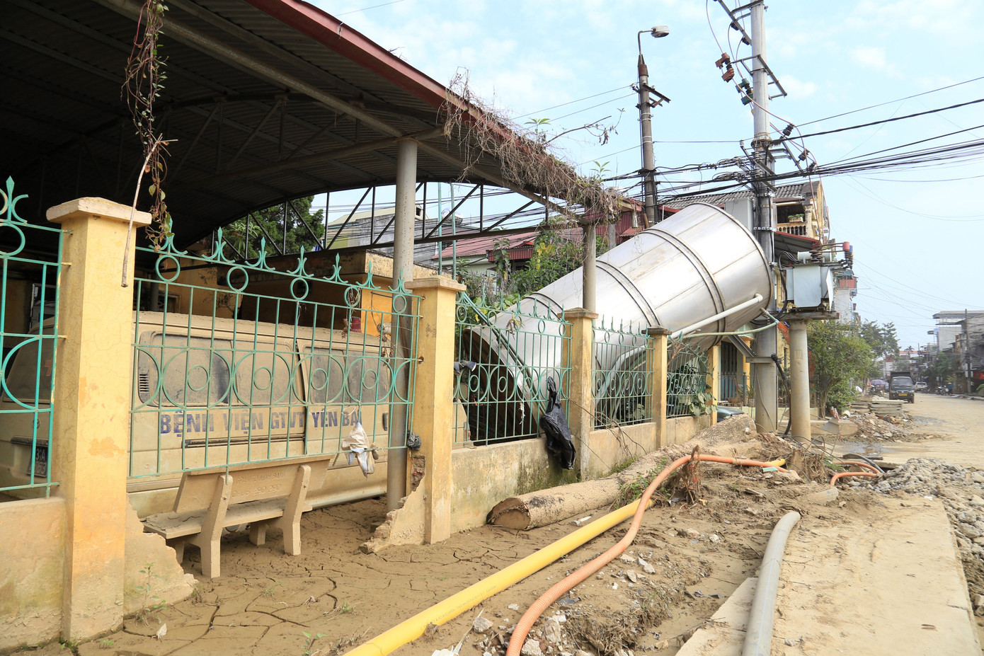 Sau đợt mưa bão vừa qua, lớp bùn đất dày khoảng 30 cm phủ kín khuôn viên bệnh viện. Xe công vụ, xe đưa đón bệnh nhân bị ngập trong bùn, hư hỏng nặng.