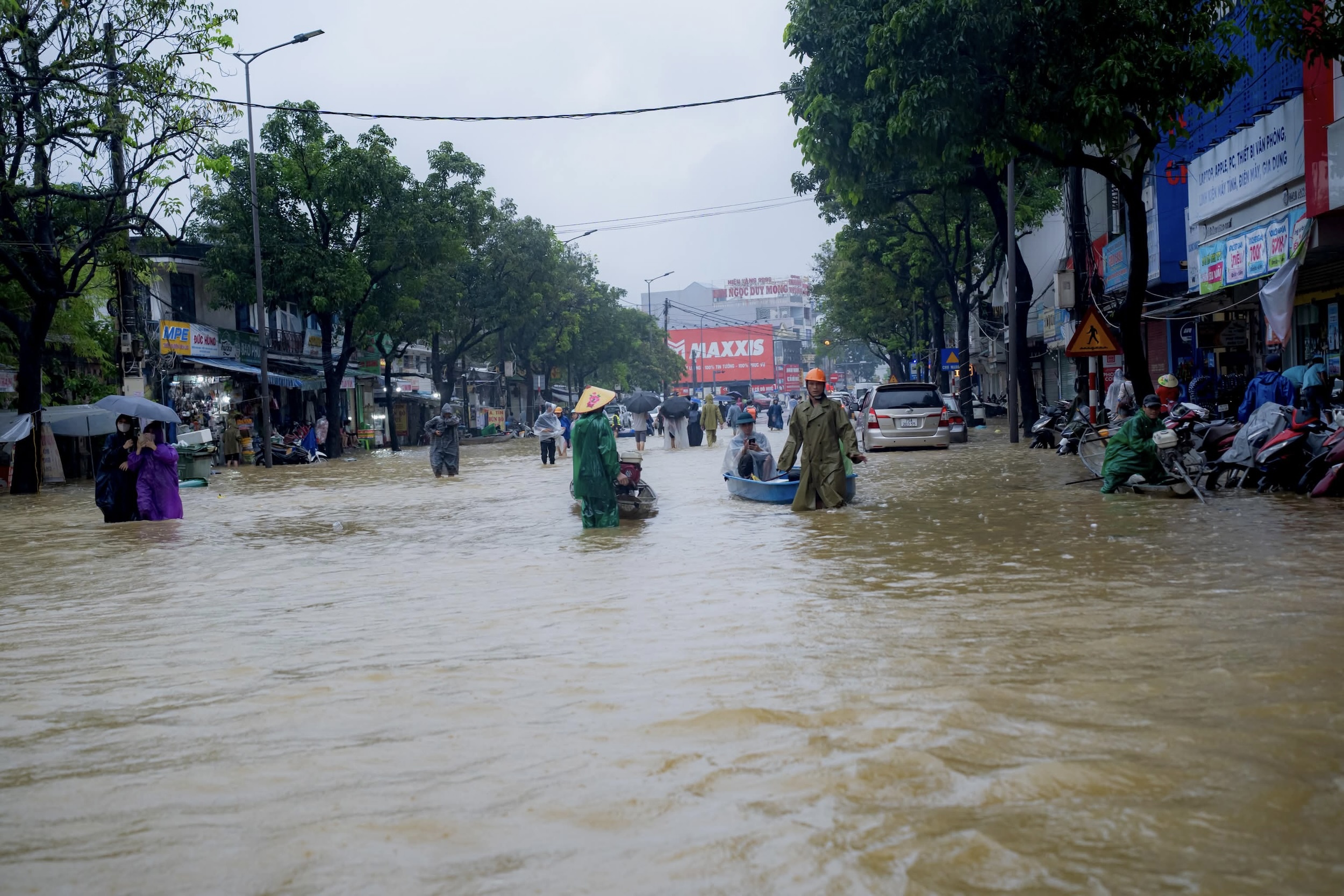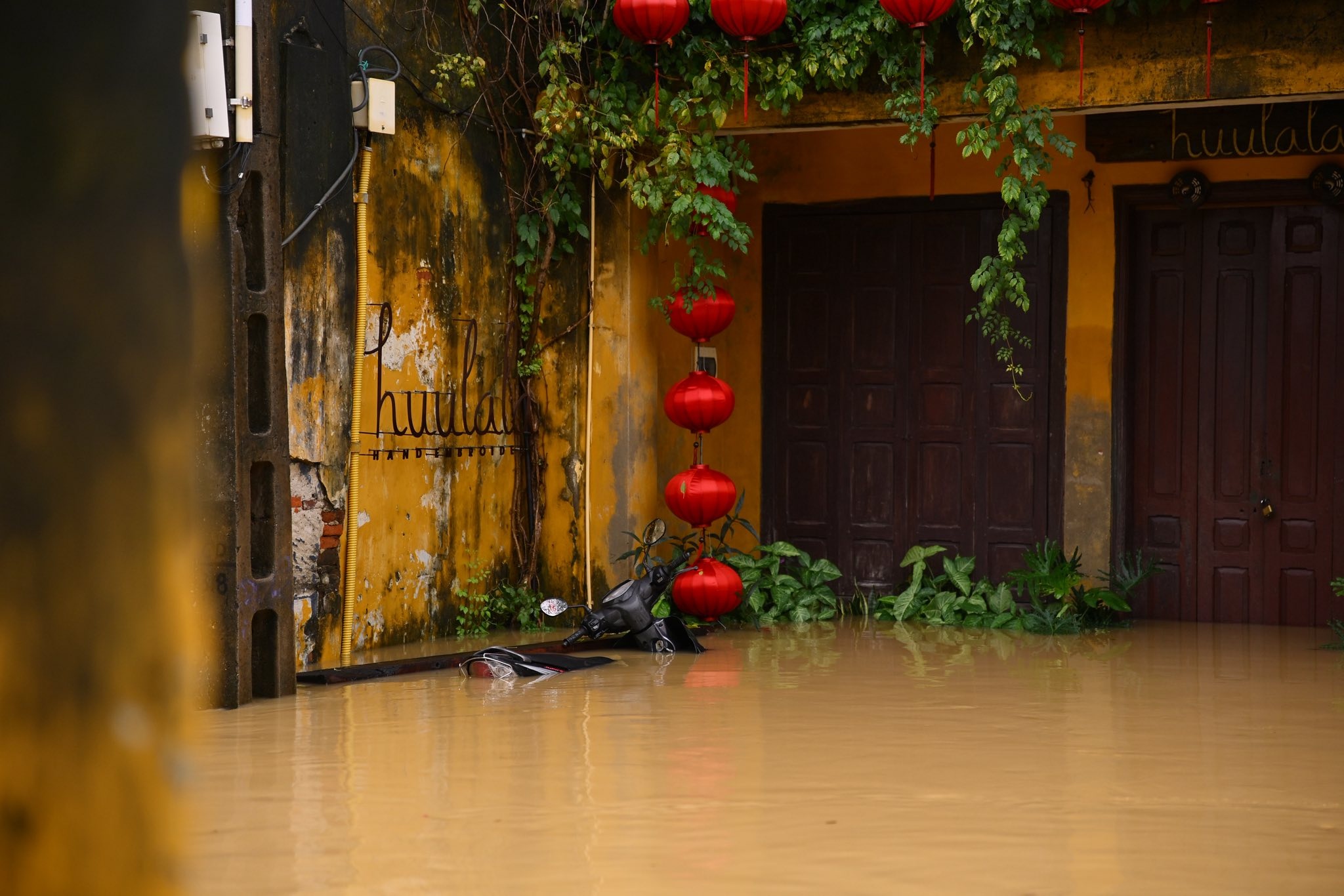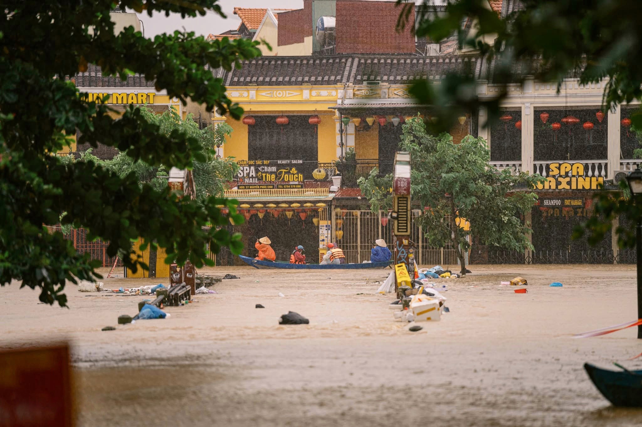 Ở Hội An, một số tuyến đường như Trần Phú, Hai Bà Trưng, Bà Triệu, Trần Hưng Đạo ngập sâu. Mực nước sông Hoài ở mức báo động 3. Ngập nặng lên đến 2 m tại một số khu vực khiến chính quyền địa phương kích hoạt phương án phòng chống thiên tai ở cấp độ cao nhất. Ảnh: Người Hội An.