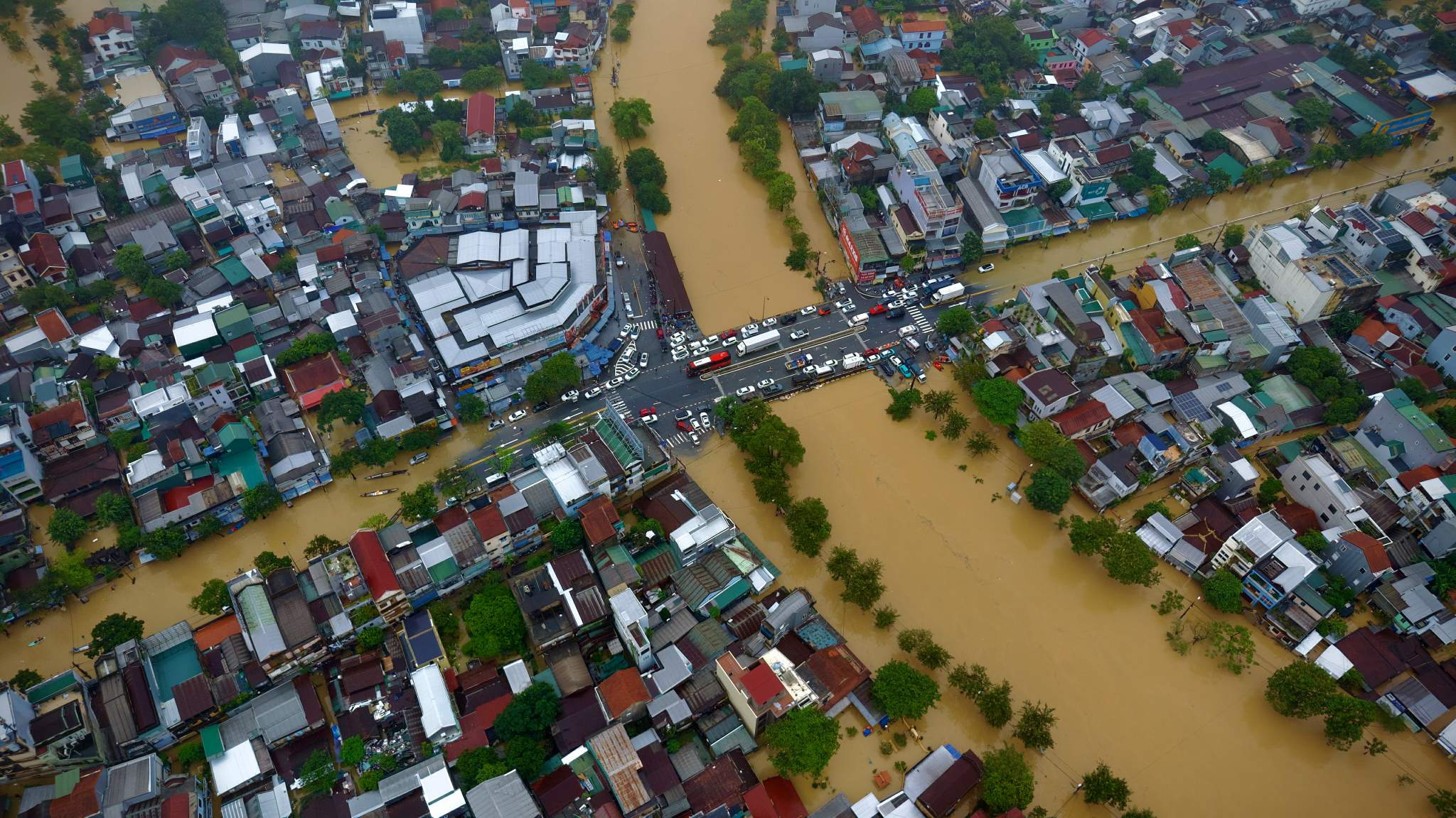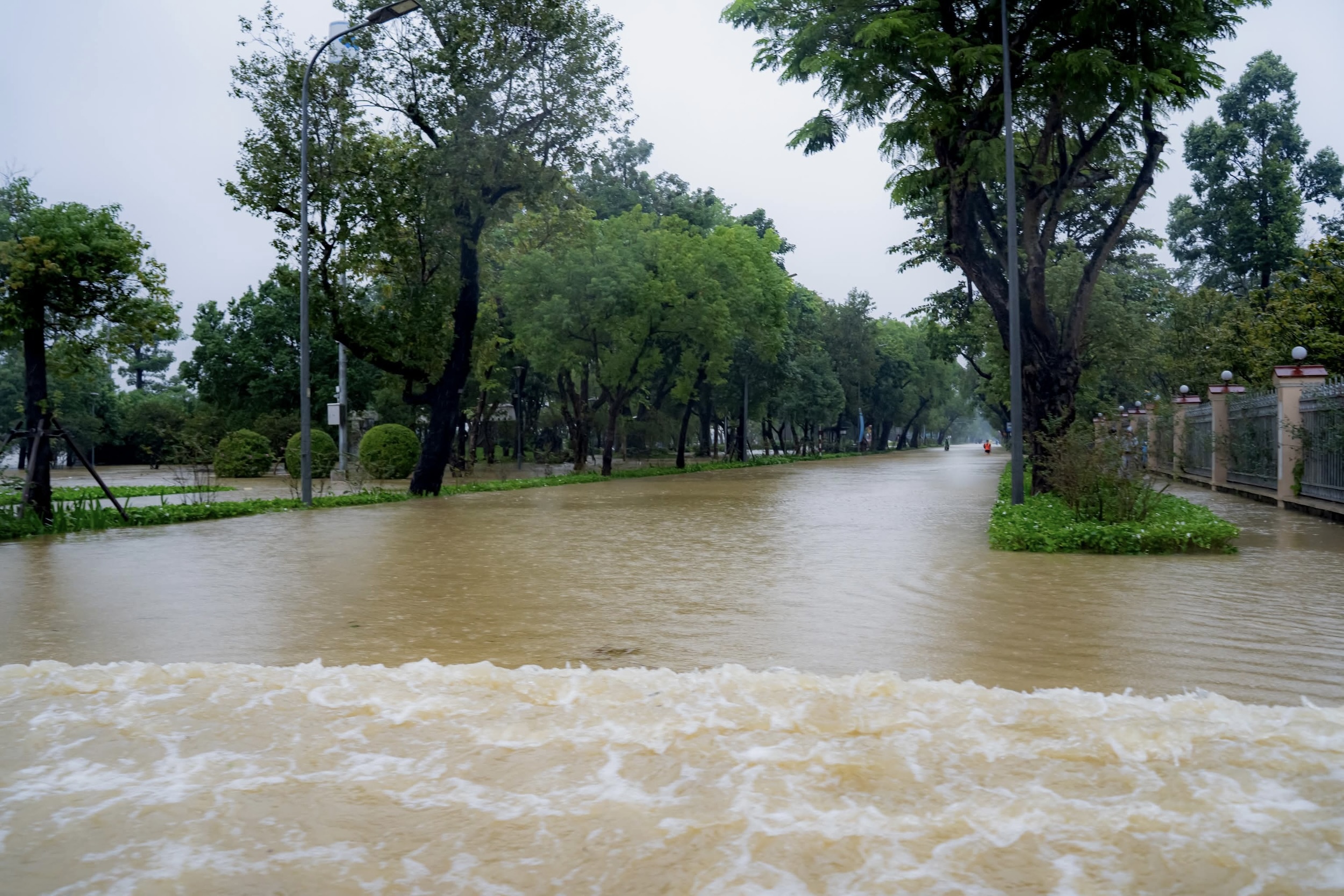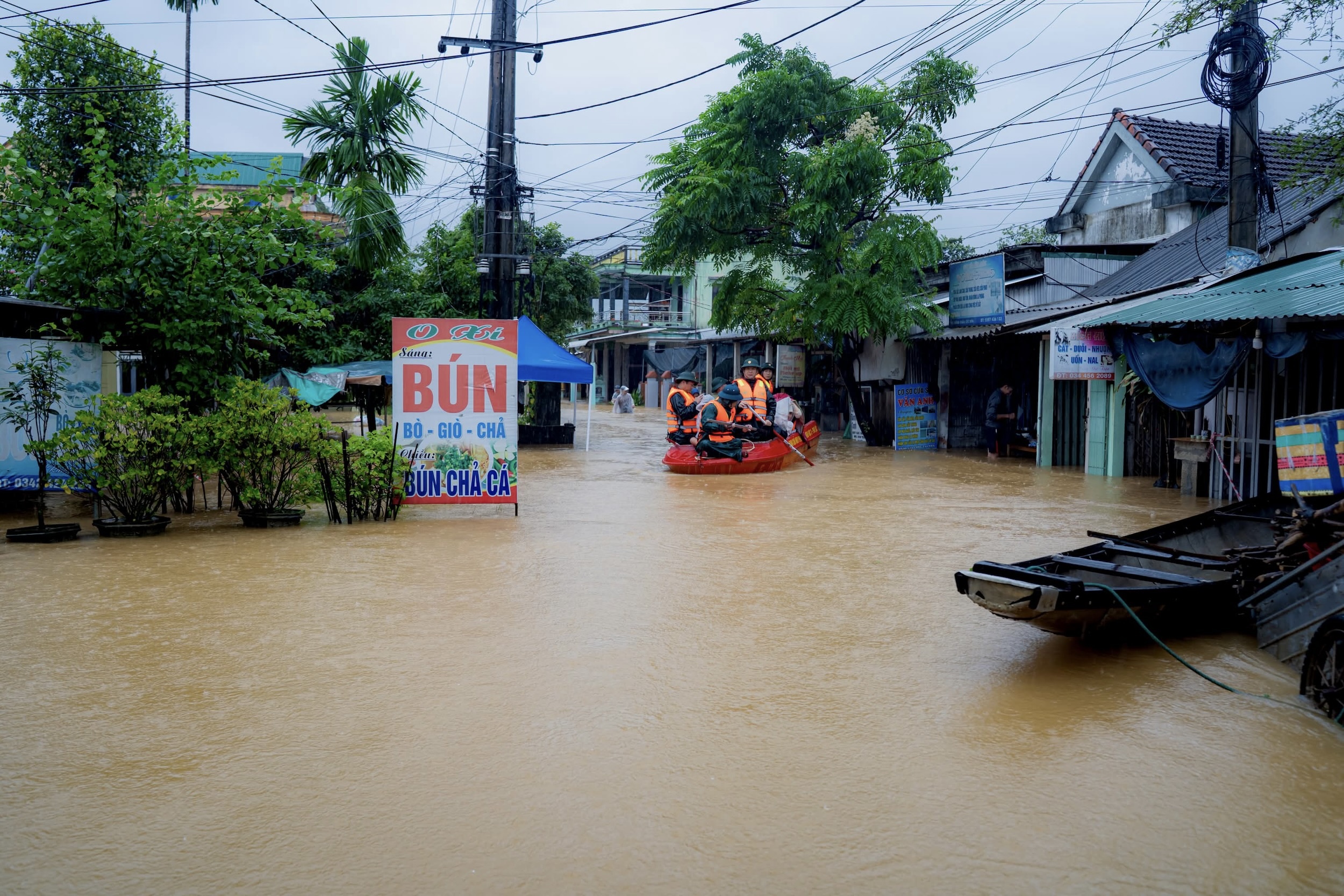 Ở Hội An, một số tuyến đường như Trần Phú, Hai Bà Trưng, Bà Triệu, Trần Hưng Đạo ngập sâu. Mực nước sông Hoài ở mức báo động 3. Ngập nặng lên đến 2 m tại một số khu vực khiến chính quyền địa phương kích hoạt phương án phòng chống thiên tai ở cấp độ cao nhất. Ảnh: Người Hội An.