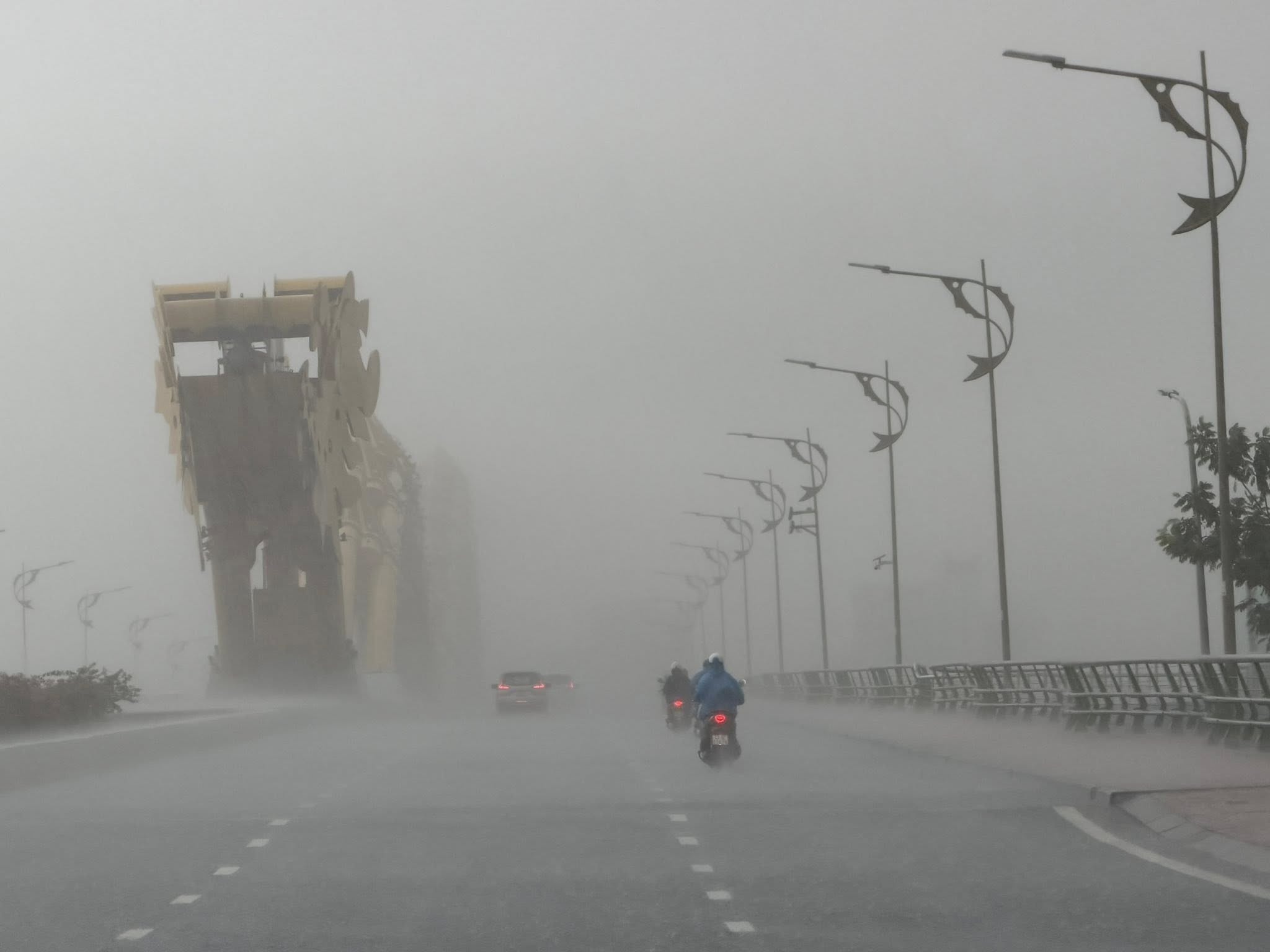 Mưa trắng trời tại cầu Rồng, khu trung tâm Đà Nẵng. Theo Đài Khí tượng Thủy văn Trung Bộ, mưa lớn sẽ giảm dần từ đây đến 30/10. Nguyên nhân dẫn đến tình trạng mưa kéo dài là bởi luồng không khí lạnh tăng cường kết hợp với nhiễu động gió đông. Ảnh: Moon Black.