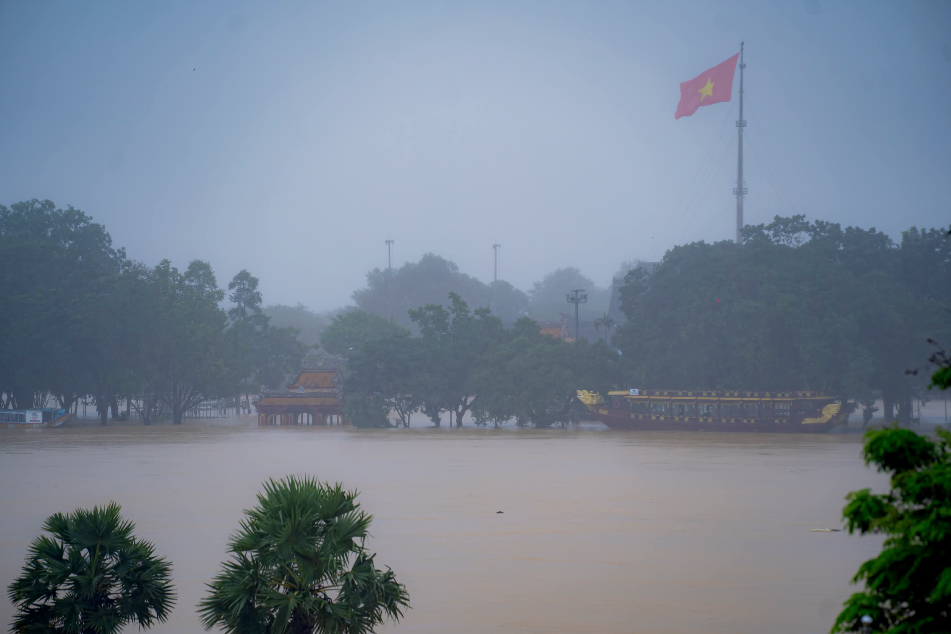 Khu vực trung tâm phường Phú Xuân (Huế), mực nước sông Hương xấp xỉ báo động 3. Di tích Nghênh Lương Đình nằm trước kinh thành Huế ngập hơn 0,5 m. Một số tuyến đường khu vực bên trong Đại Nội, lăng Tự Đức, lăng Minh Mạng bị chia cắt do nước lũ. Trung tâm Bảo tồn Di tích cố đô Huế buộc thông báo dừng hoạt động tham quan ngày 27/10. Ảnh: Lê Đình Hoàng.