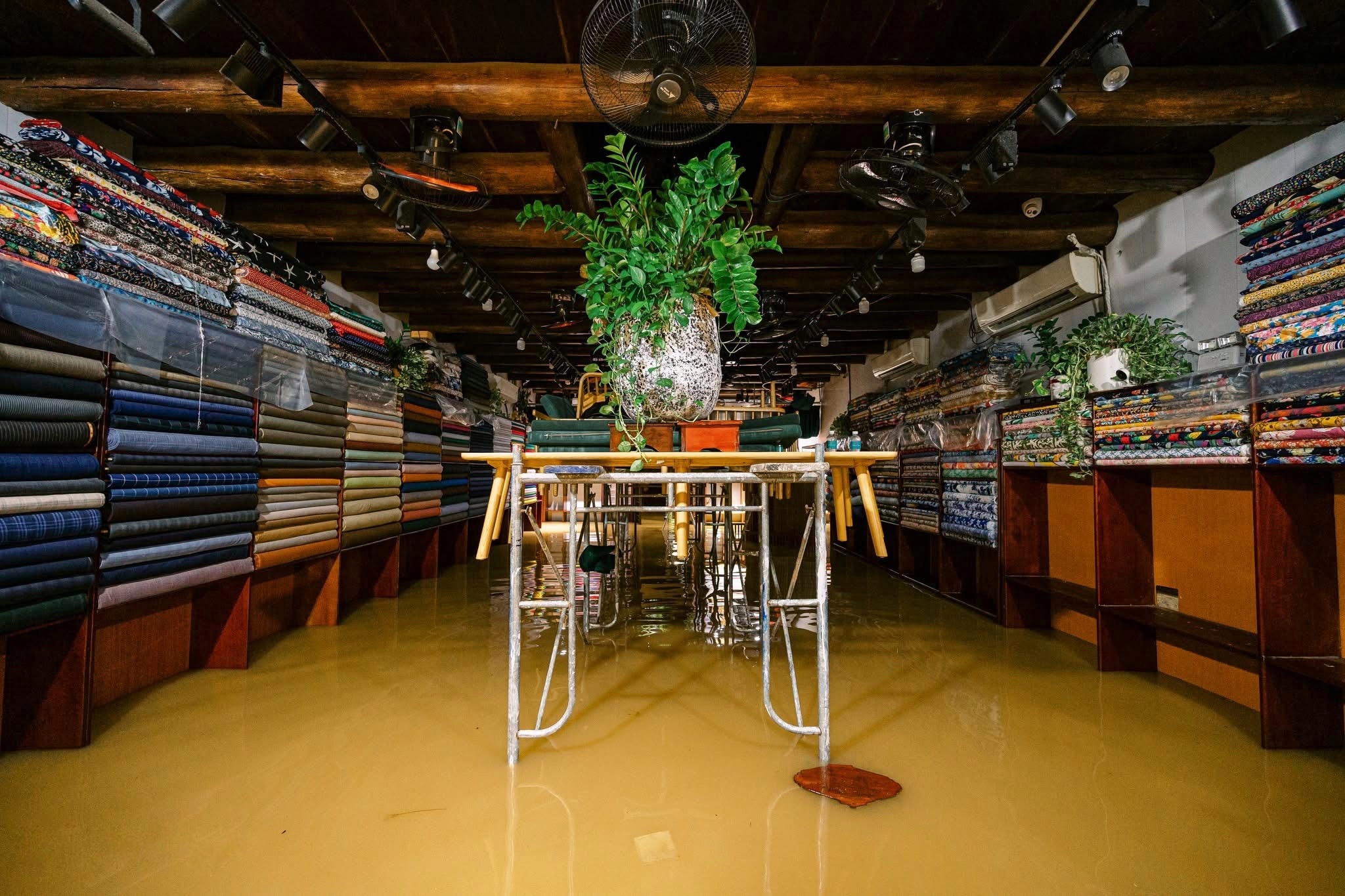 Chủ một cửa hàng vải đưa hàng hóa lên cao để bảo vệ tài sản. Ảnh: Người Hội An.