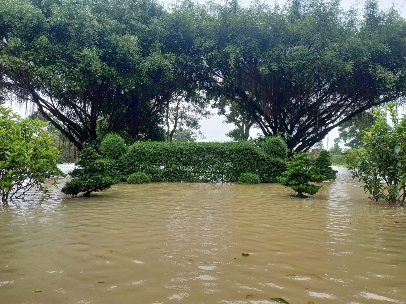 Vườn kiểng, bon sai, cây xanh bên trong Đại Nội bị nước lũ nhấn chìm. Ảnh TTDT Huế