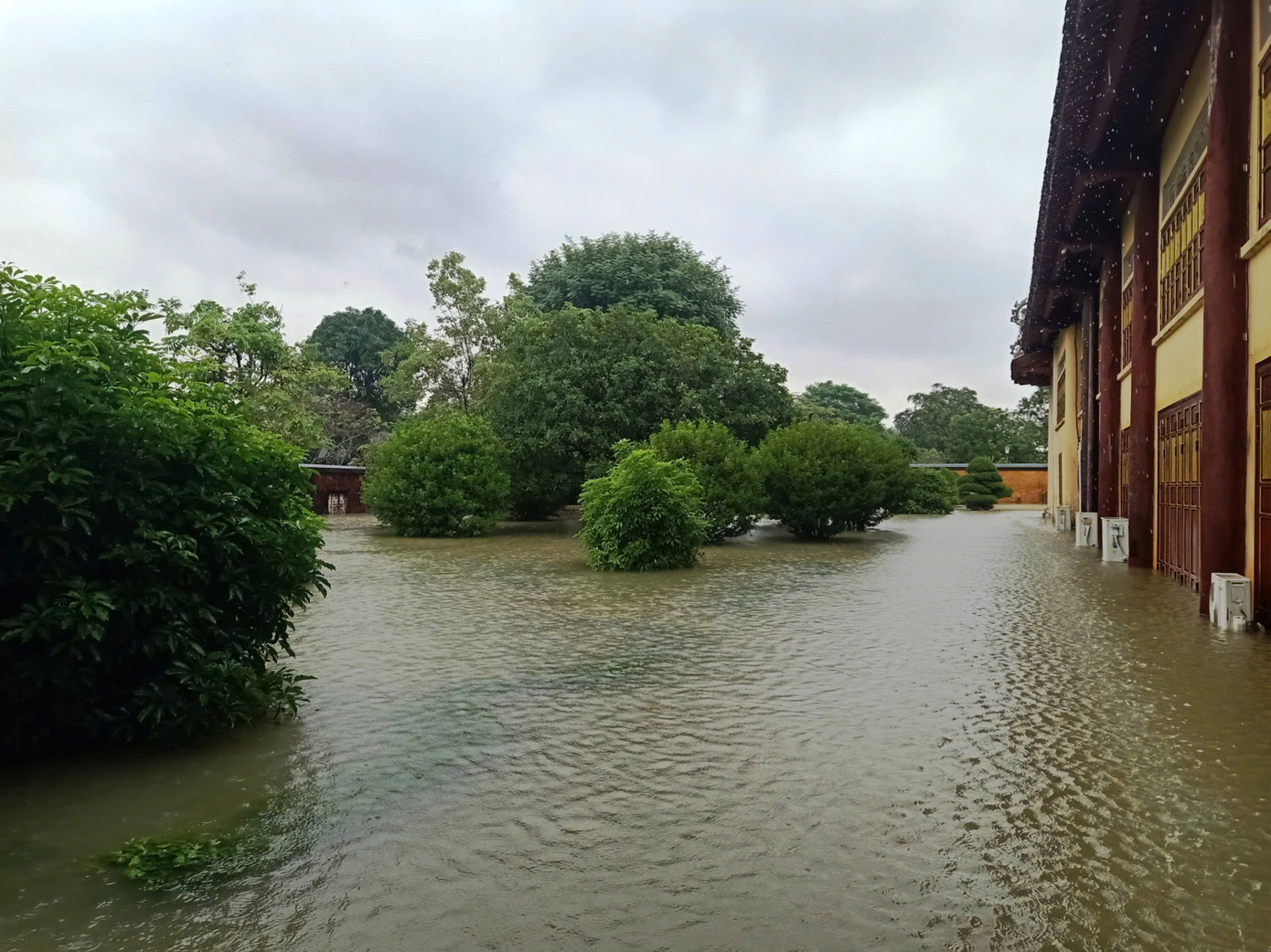 Các cung điện ngập 0,3m; các lăng Gia Long, Minh Mạng, Thiệu Trị, Dục Đức ngập sâu từ 1 - 1,7m; lầu Tàng Thơ ngập hơn 1m. Trung tâm Bảo tồn Di tích Cố đô Huế cho biết, các phương án bảo vệ hiện vật, công trình đã được triển khai, đến nay chưa ghi nhận thiệt hại. Ảnh Nguyễn Phong