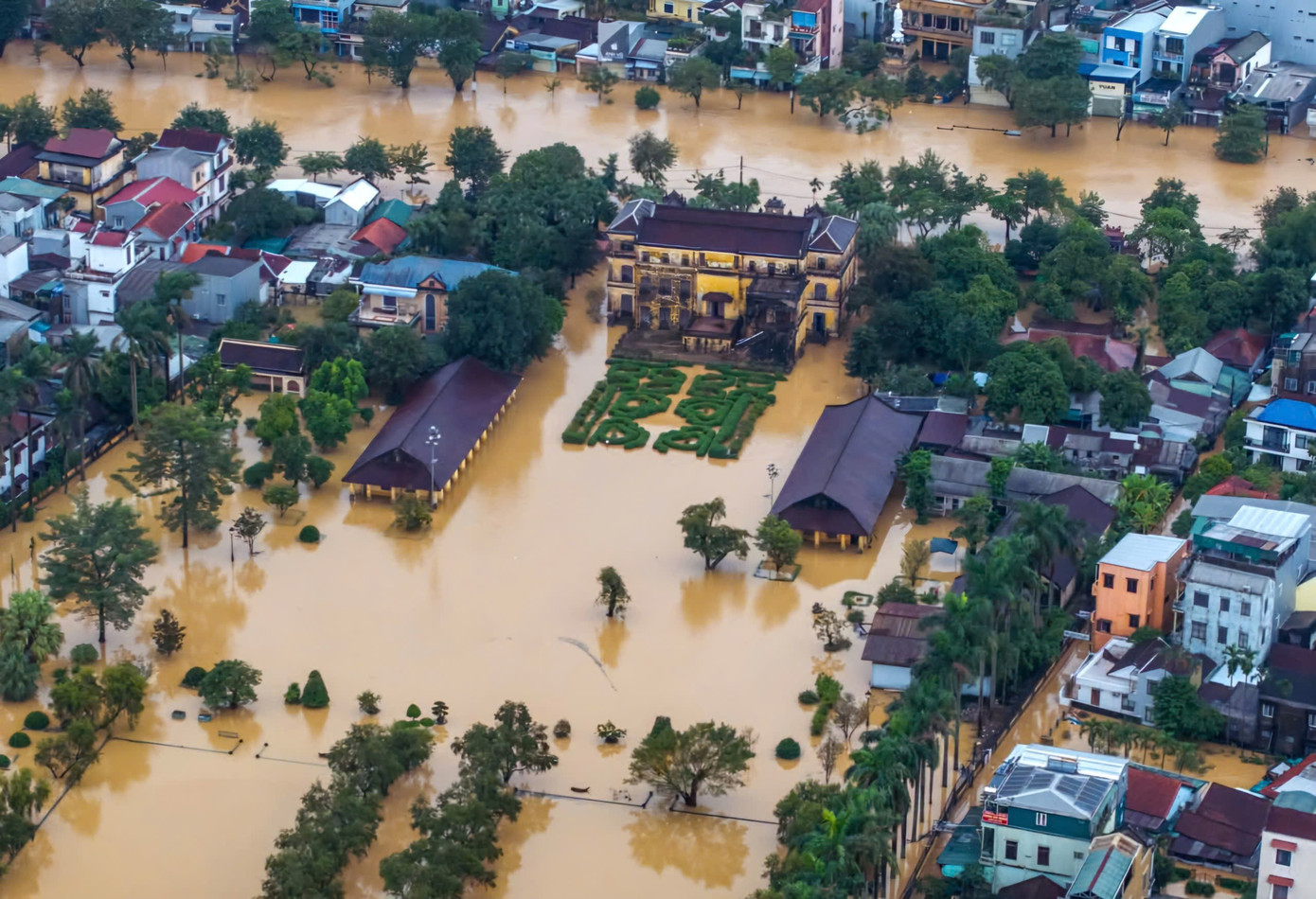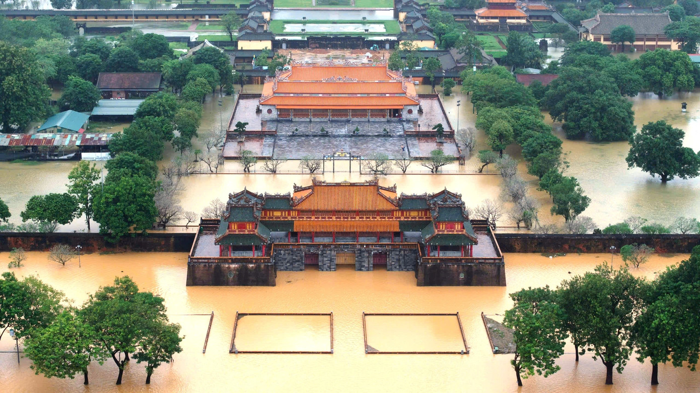 Nhìn trên cao, di tích Ngọ Môn, phía sau là điện Thái Hòa, đều bị bao quanh bởi nước lũ. Ảnh TTBTDT Huế