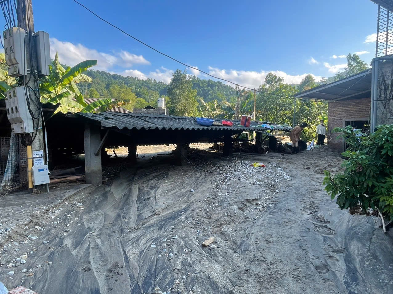 Ông Vũ Xuân Thủy, Chủ tịch UBND xã Văn Bàn cho biết, nhiều nơi trên địa bàn hiện đều trong tình trạng chia cắt, thiệt hại lớn về nhà ở, hạ tầng và hoa màu. Nhiều công trình đường giao thông, công trình thủy lợi bị ảnh hưởng nặng nề. Tình hình thời tiết diễn biến phức tạp, nguy cơ sạt lở cao khiến công tác khắc phục trở nên khó khăn. Trong ảnh: Nhà ở, chuồng trại chăn nuôi của người dân ngập sâu trong lớp bùn, đất.