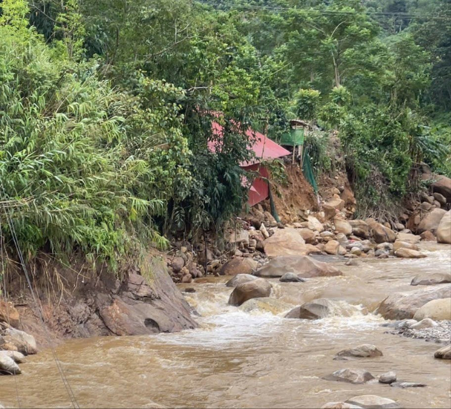 “Chúng tôi đã huy động hơn 300 người cùng nhiều phương tiện giúp dân di chuyển tài sản, dựng lại đường sá. Chúng tôi đang tìm quỹ đất và xây nhà tái định cư lâu dài cho bà con. Tuy nhiên, xã và nhân dân thiếu thốn về kinh tế, địa bàn dốc, đất yếu, khó đảm bảo an toàn. Rất mong tỉnh và các nhà hảo tâm hỗ trợ kinh phí, giúp dân sớm ổn định cuộc sống”, ông Thủy nói. Trong ảnh: Những lớp đất, đá men theo suối, nơi sinh sống của người dân bị nước lũ khoét sâu.