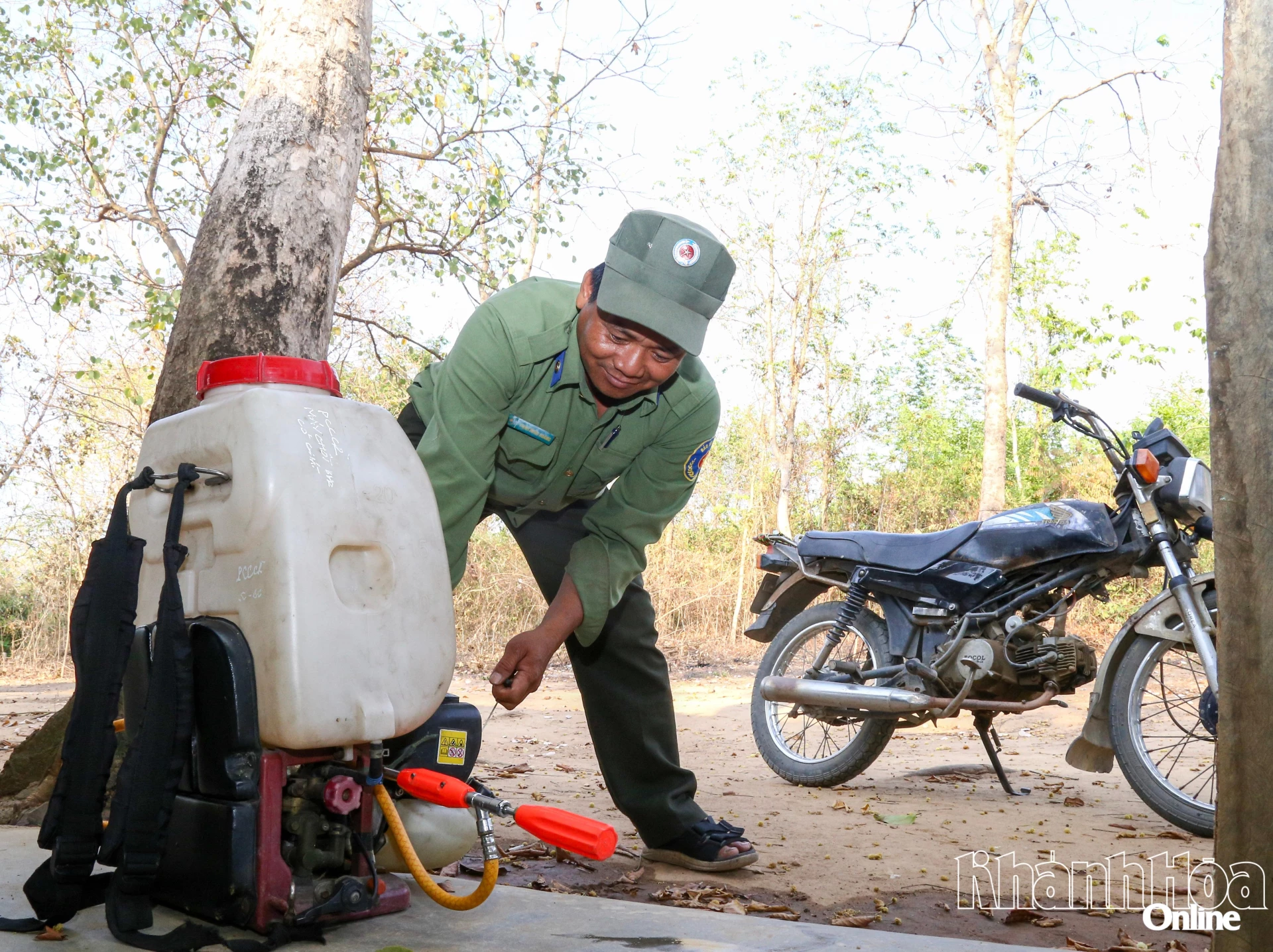 Một nhân viên bảo vệ rừng tại Chốt nước nóng (trong rừng căm xe ở xã Tây Ninh Hòa) kiểm tra dụng cụ chữa cháy.