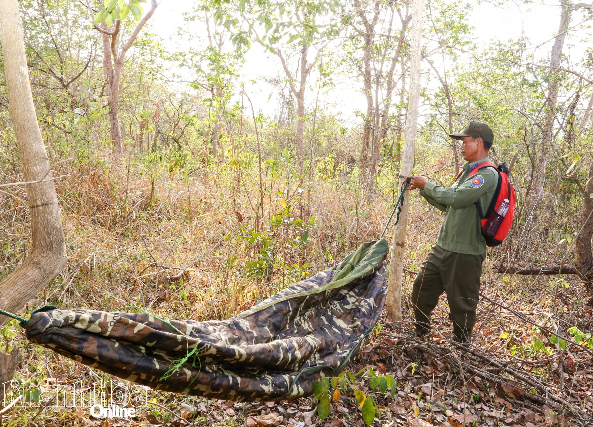 Một nhân viên quản lý bảo vệ rừng mắc võng canh lửa, giữ rừng căm xe.