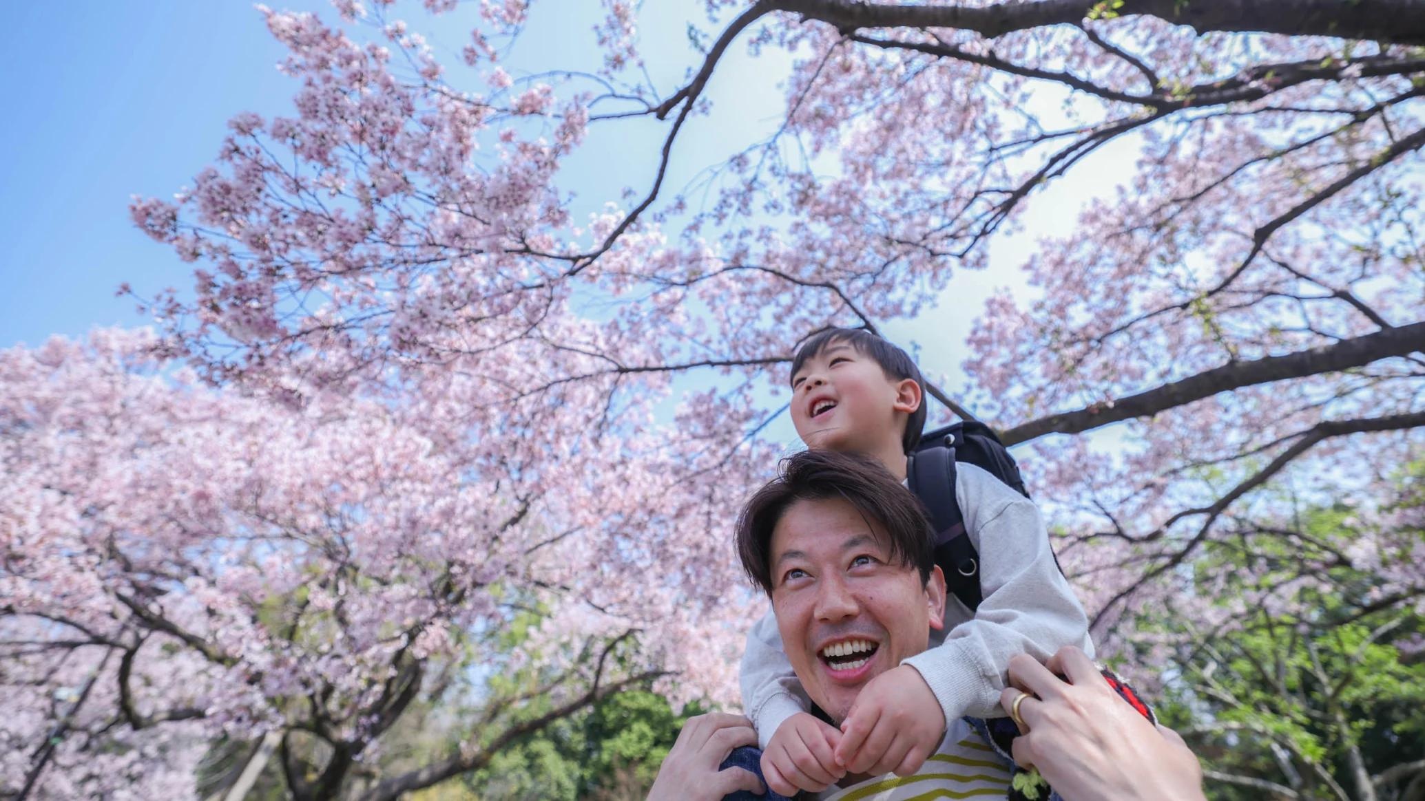 Cậu bé Natsume Kimoto, chuẩn bị vào lớp 1 từ tháng 4, ngồi trên vai bố ngắm hoa anh đào ở Tokyo hôm 29/3. Ảnh: Yuki Kohara.