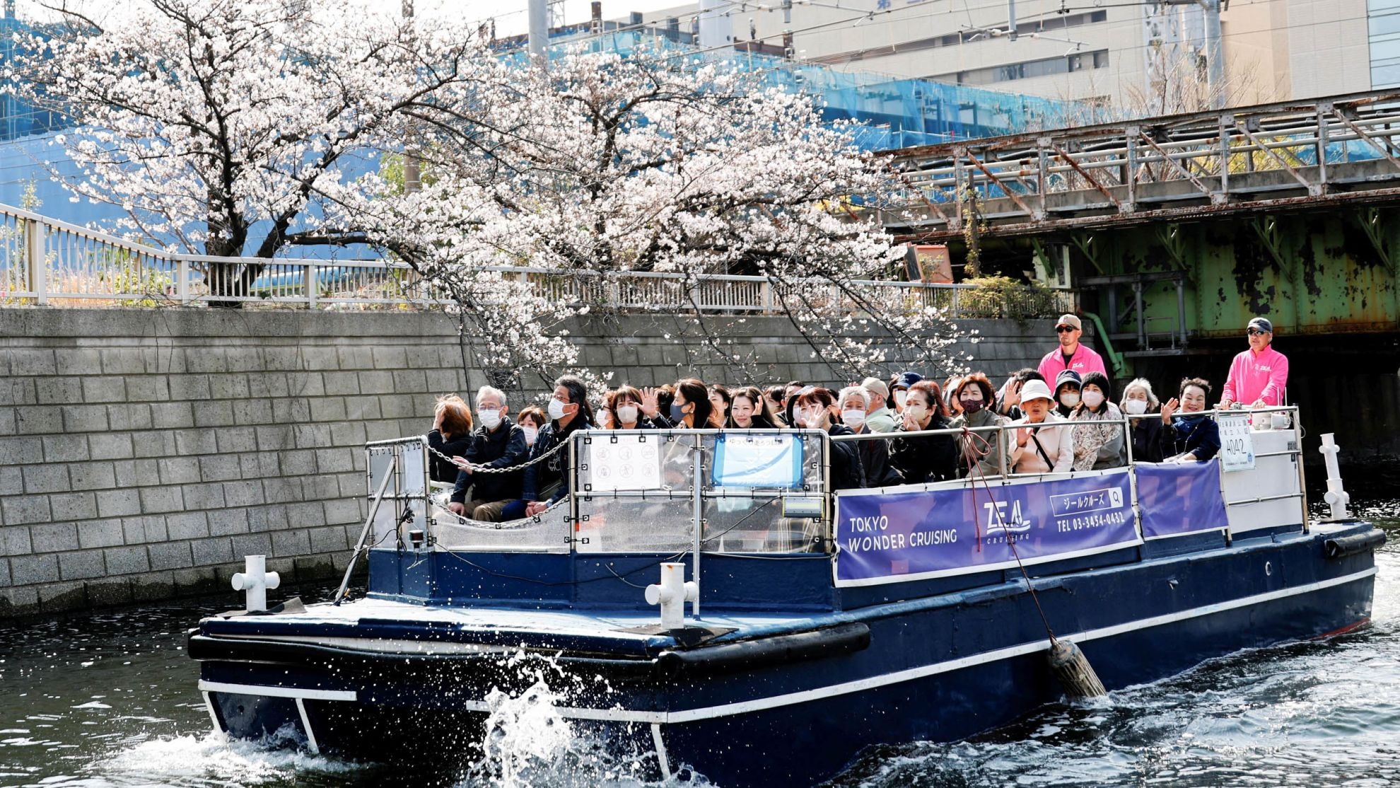 Một chiếc thuyền du ngoạn lướt qua hai bên bờ phủ đầy hoa anh đào nở rộ dọc sông Meguro ở Tokyo, ngày 30/3. Ảnh: Kim Kyung-Hoon/Reuters.