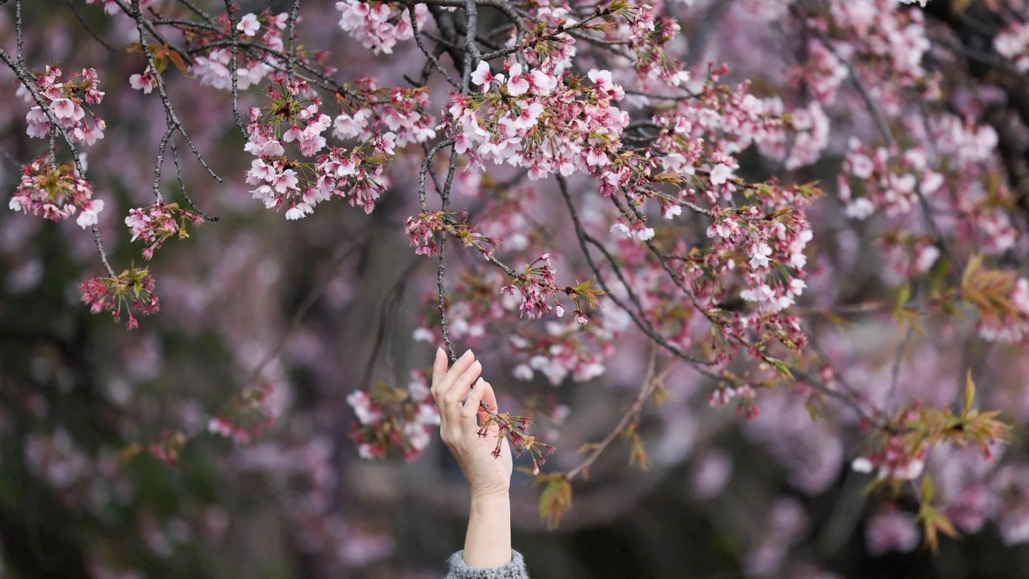 Một du khách với tay chạm vào những bông hoa anh đào nở sớm tại công viên Ueno ở Tokyo, Nhật Bản ngày 17/3. Ảnh: Issei Kato/Reuters.