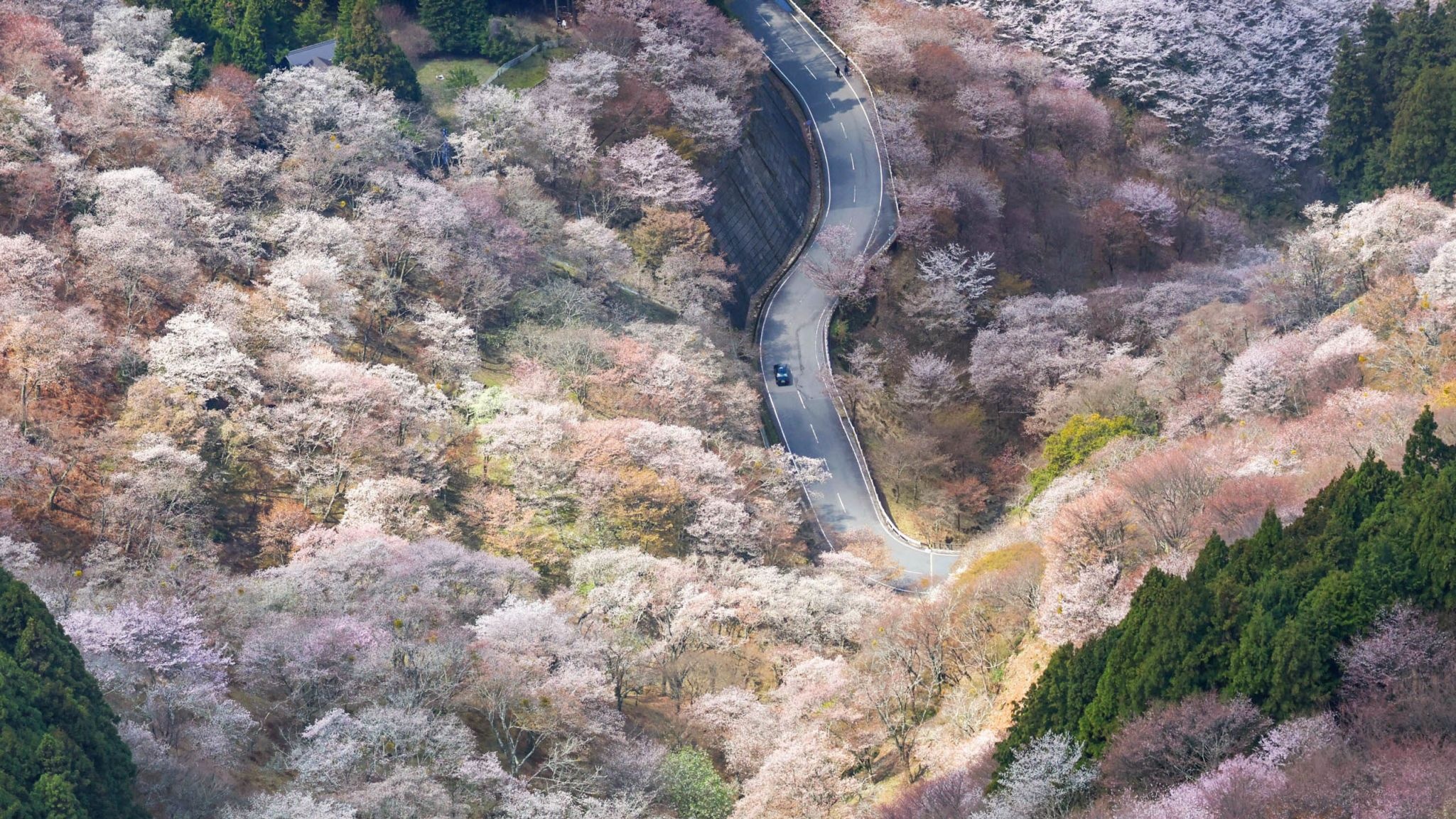 Trên núi Yoshino thuộc tỉnh Nara, sắc hoa trải dài phủ lên sườn núi ngày 2/4. Ảnh: Kyodo.