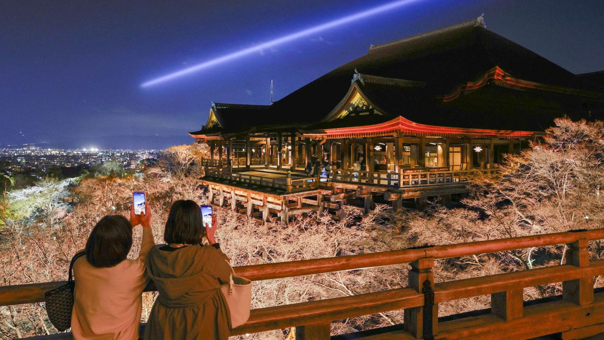 Trong khi đó, khoảng một nghìn cây anh đào đã được thắp sáng tại chùa Kiyomizu ở Kyoto trong một sự kiện thử nghiệm vào ngày 26/3, một ngày trước khi bắt đầu chương trình ngắm hoa đêm đặc biệt mùa xuân kéo dài đến ngày 5/4. Ảnh: Kyodo.