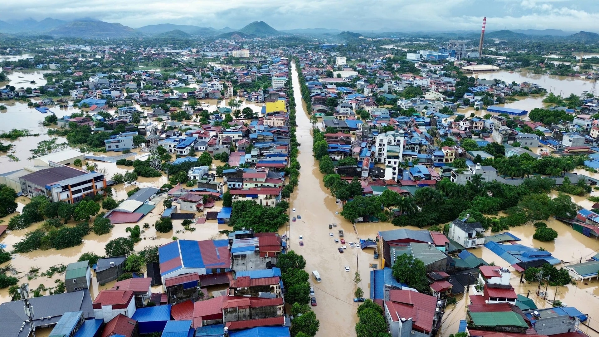 Nhiều tuyến phố trung tâm tỉnh Thái Nguyên biến thành con sông, nhiều nhà dân chỉ còn thấy phần mái khi nước dâng cao.