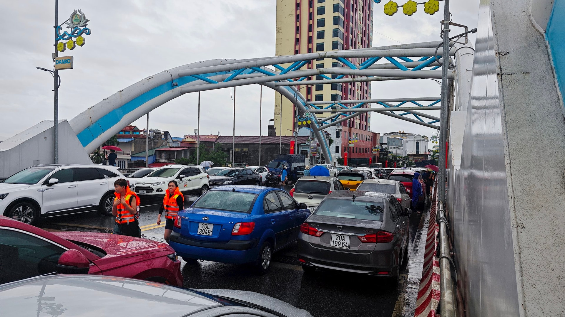 Ô tô xếp hàng dài trên cầu tránh lũ.