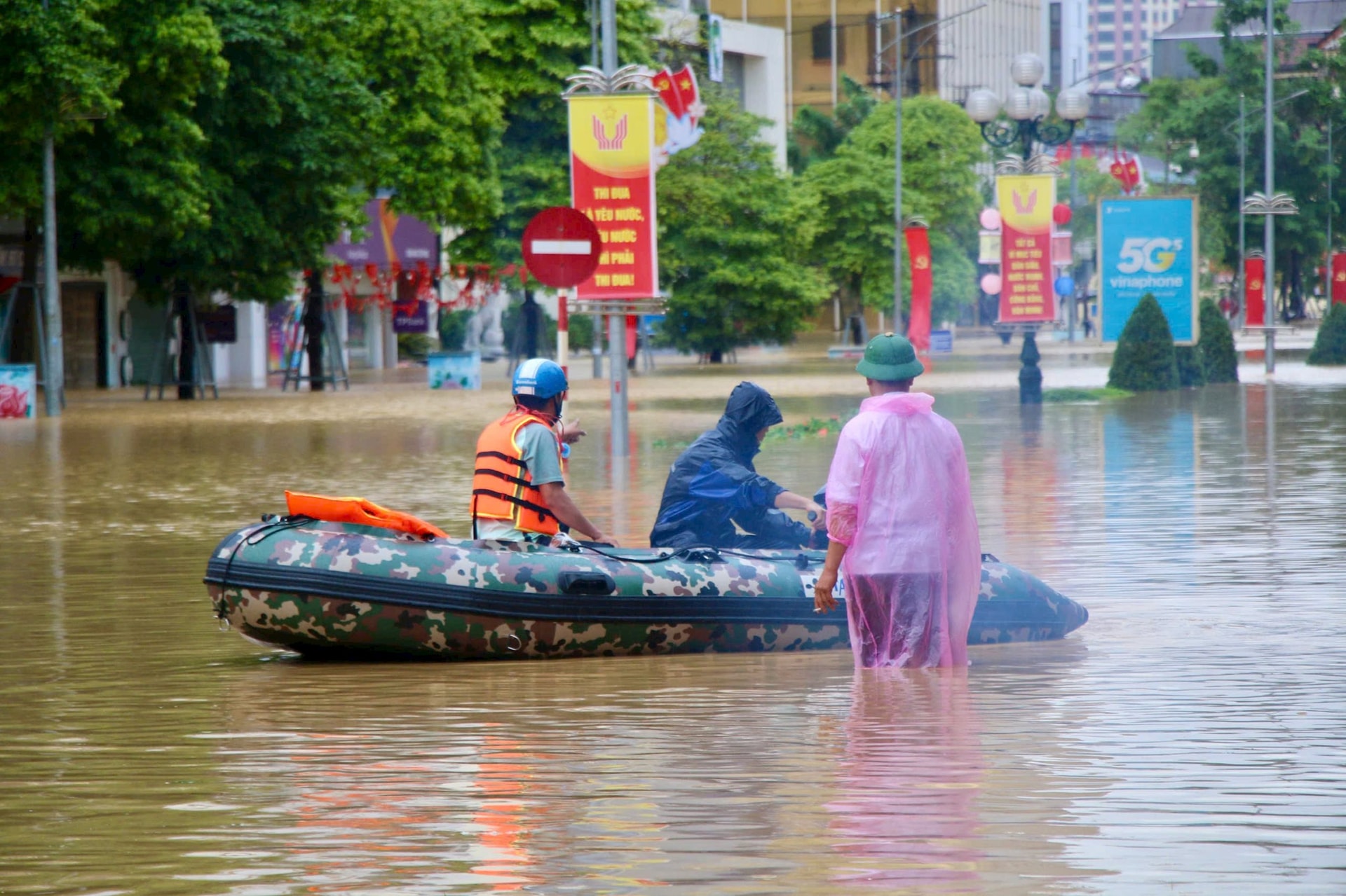 Cán bộ cứu hộ chèo thuyền giữa những tuyến phố ngập sâu để thực hiện công tác cứu hộ.