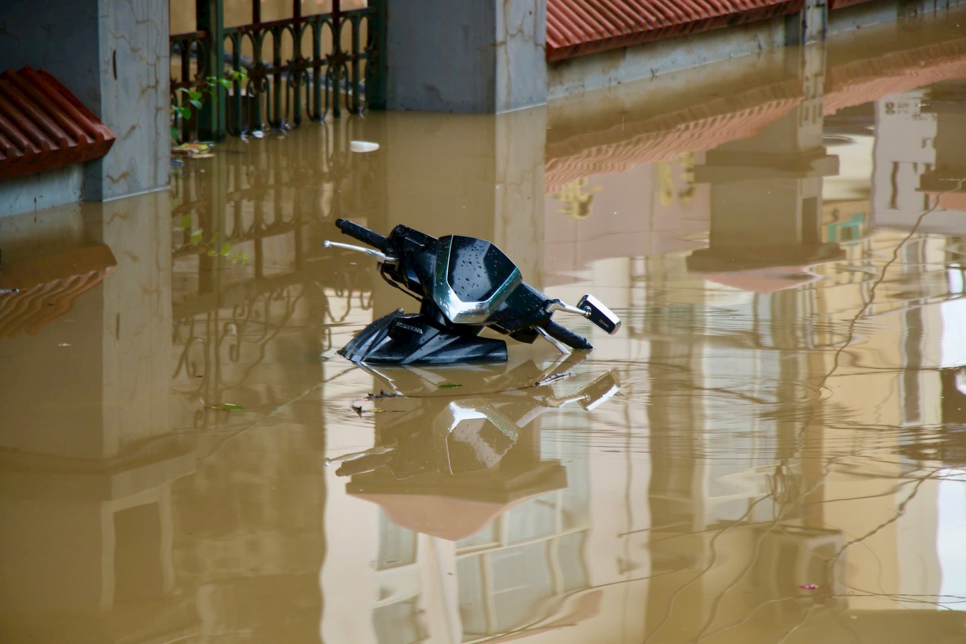 Xe máy bị bỏ lại bên lề đường — chủ nhân chịu cảnh vứt đi vì nước dâng quá nhanh.