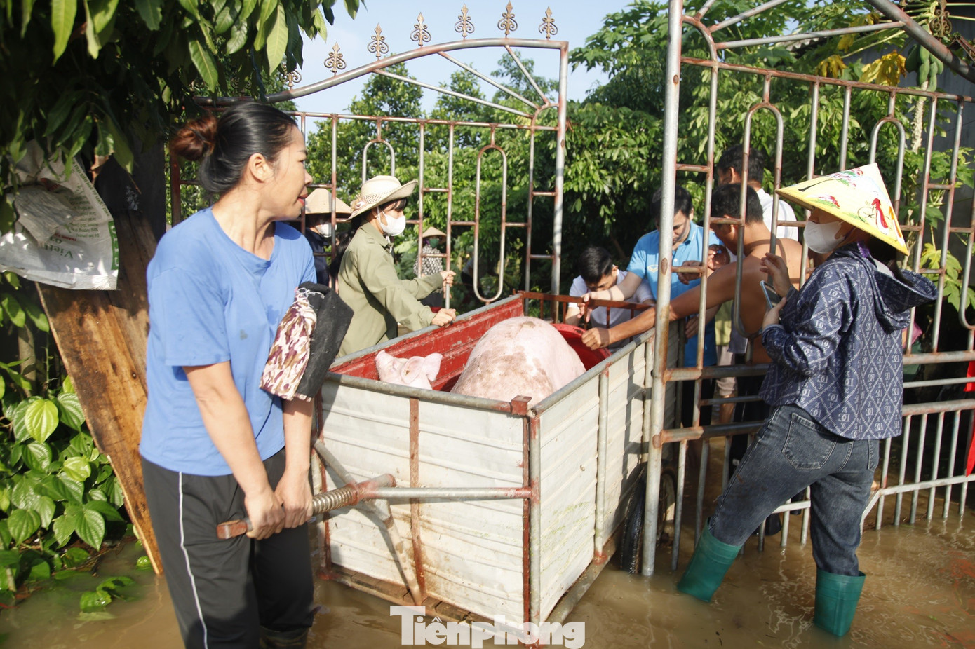 Người dân xã Tiên Lục di chuyển vật nuôi khỏi vùng ngập lụt. Ảnh: Nguyễn Thắng