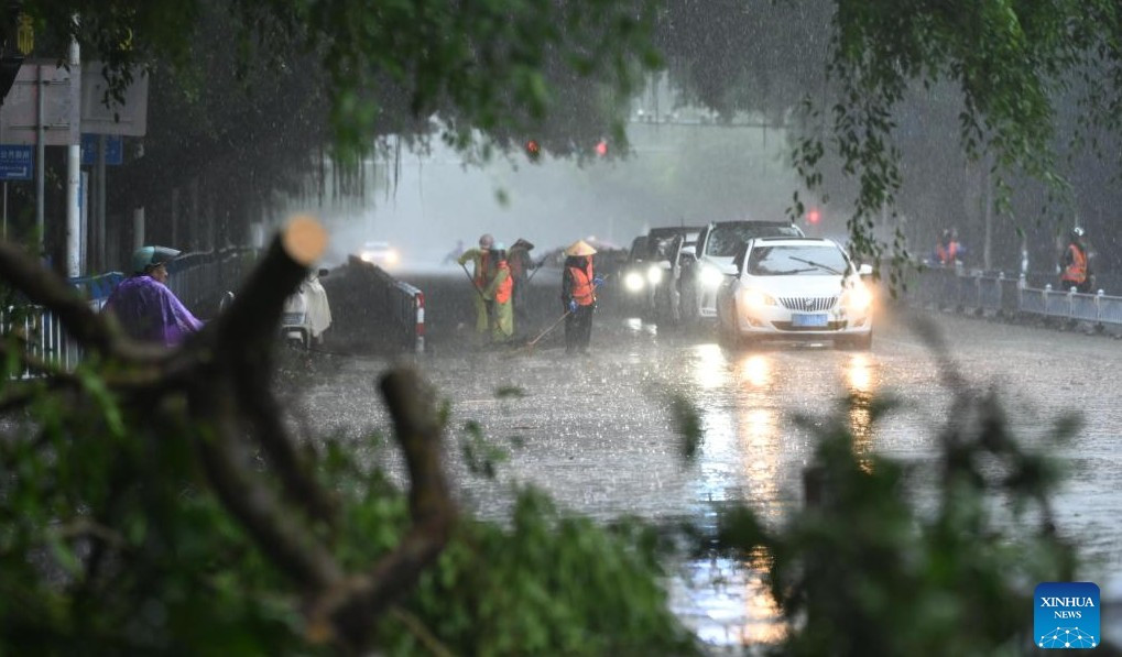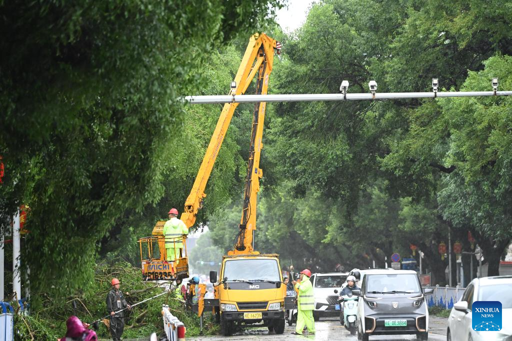 Nhân viên vệ sinh dọn dẹp cây đổ tại thành phố Khâm Châu ngày 6/10.