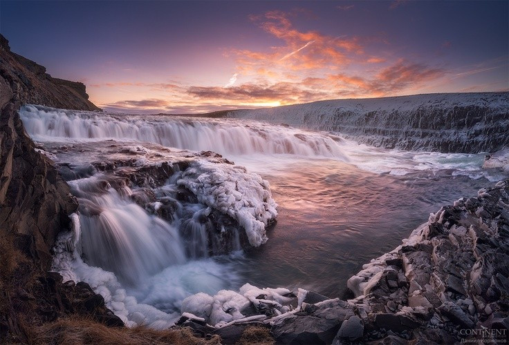 Cảnh sắc thay đổi theo mùa. Mùa hè, Gullfoss rực rỡ dưới ánh nắng. Đền mùa đông, thác đóng băng một phần, tạo nên khung cảnh huyền ảo như cổ tích. Ảnh: Pinterest.