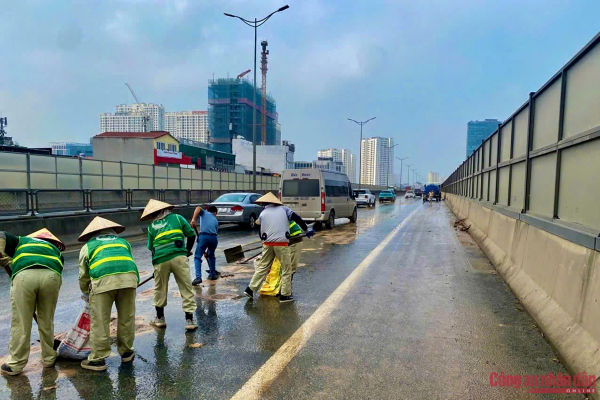 Tổ công tác nhanh chóng chặn dừng phương tiện để kiểm tra đồng thời tổ chức phân luồng, cảnh báo cho các xe di chuyển trên Vành đai 3 trên cao về tình trạng rơi vãi bùn để phòng ngừa tai nạn.