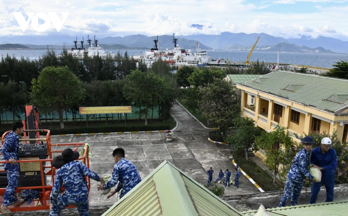 Cán bộ, chiến sĩ cảnh sát biển 3 tổ chức gia cố mái nhà tại đơn vị