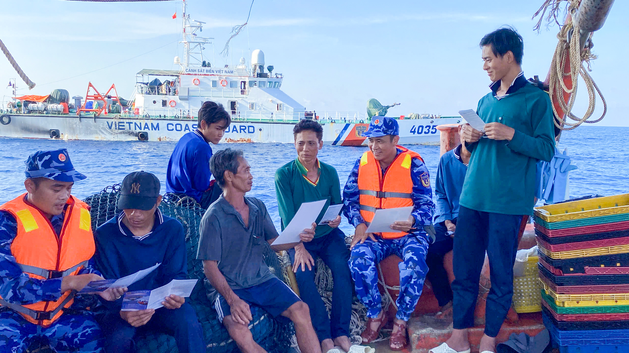 Vùng Cảnh sát biển 4 tuyên truyền, hướng dẫn các quy định của pháp luật về chống khai thác IUU cho ngư dân. Ảnh: CSB