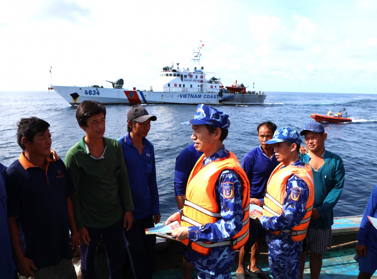 Bên cạnh kiểm tra, lực lượng còn trao nhu yếu phẩm, tài liệu pháp luật và cờ Tổ quốc để động viên ngư dân yên tâm bám biển, phát triển kinh tế gắn với bảo vệ chủ quyền.