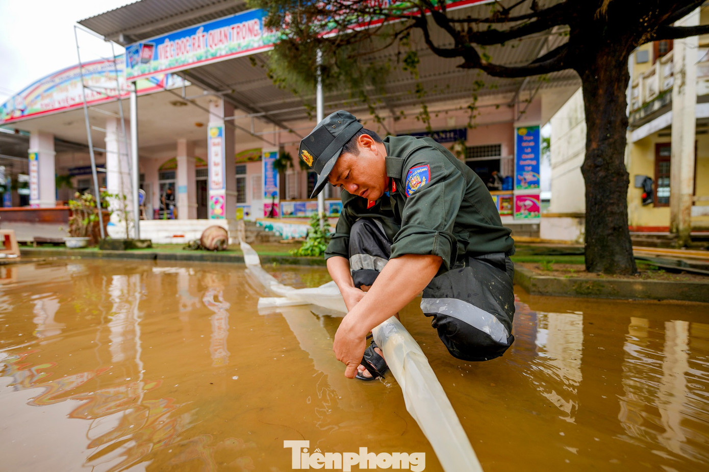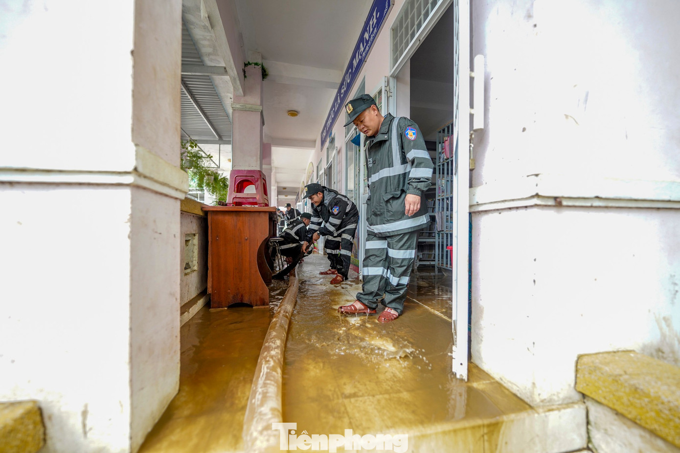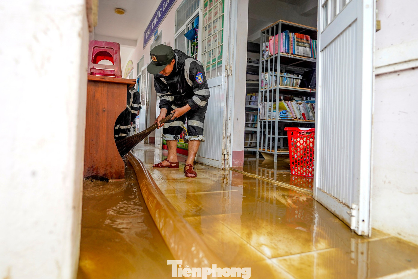 Bùn bám khá dày và chặt, cán bộ chiến sĩ Trung đoàn Cảnh sát cơ động Tây Nguyên phải dùng máy bơm, đưa nước vào để xịt rửa, làm sạch, trả lại phòng học khang trang cho các em học sinh trước ngày trở lại trường.